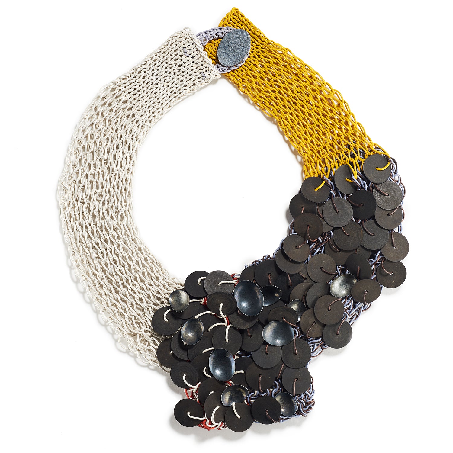 Here, Swanson knits a leather laden masterpiece to comfortably wear around the neck. Its soft, smooth surfaces are palpable to the touch as they are an array of delight to behold. Working with a muted palette to please the eye, she knits a concoction of alabaster and marigold to balance the vast textile lattice. Approaching the core of her work, a vivacious field of undulating silver and flattened vinyl discs comprise a multi-faceted arrangement of complex composition. Underneath their dark assemblage are the tracings of crimson, white, lavender and black leather stitchings. Swanson cleverly teases the eye with her selections of color as one tries to decipher the intriguing dichotomy taking place behind its billowing surface. On the body the piece is a striking work, which rests peacefully upon the collar. Yet, rather a dynamic and abstract beauty to discover and ever a treasure to wear in its unparalleled magnificence.