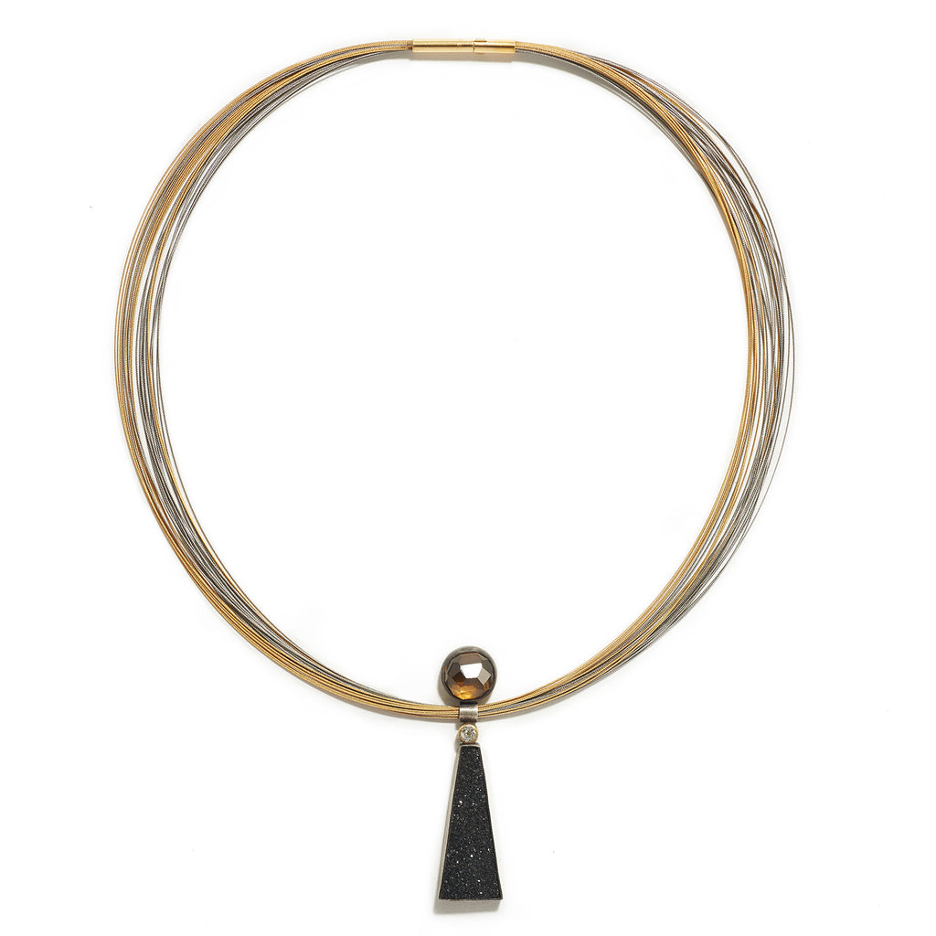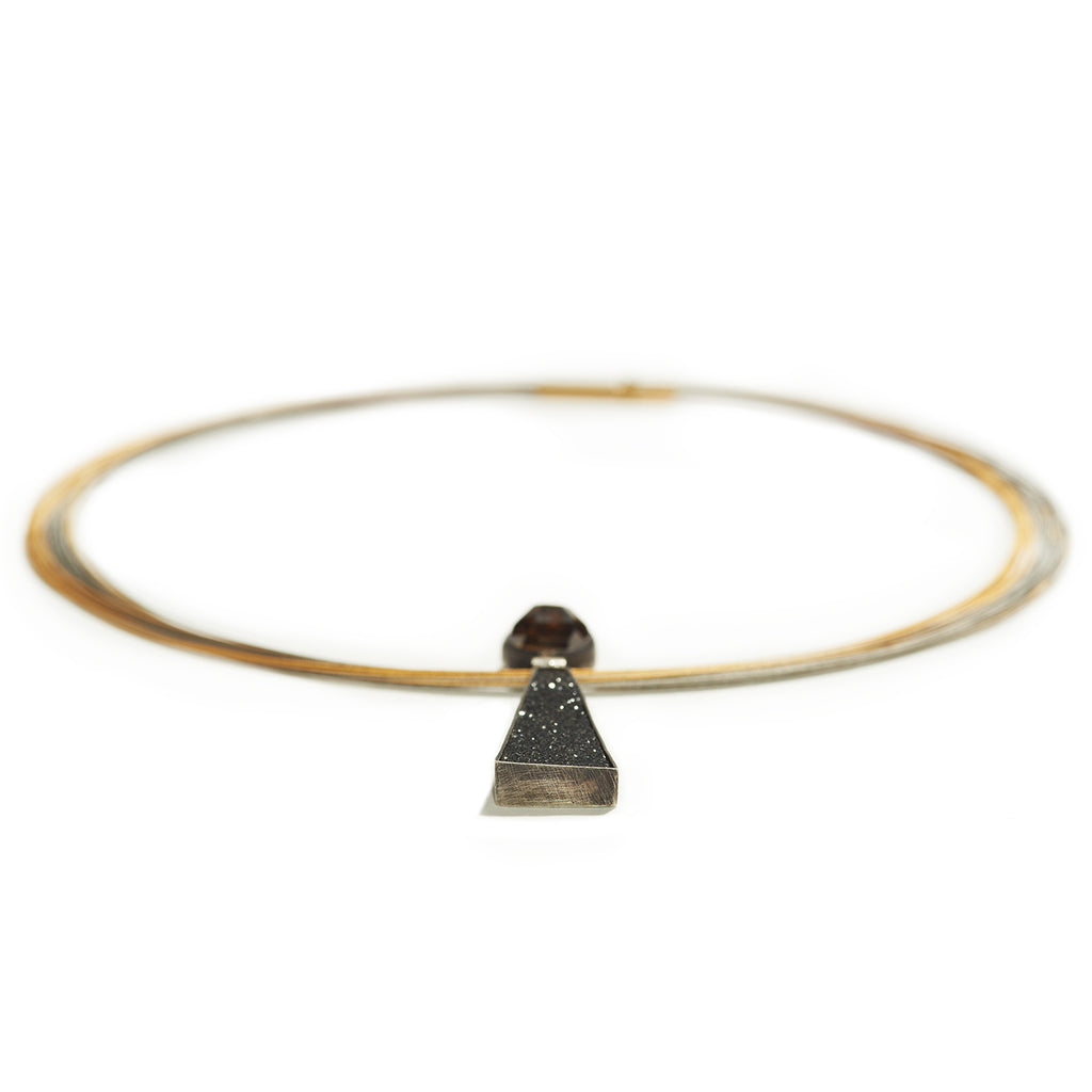 Oxidized sterling silver, 18K yellow gold, black druzy, diamonds, honey quartz