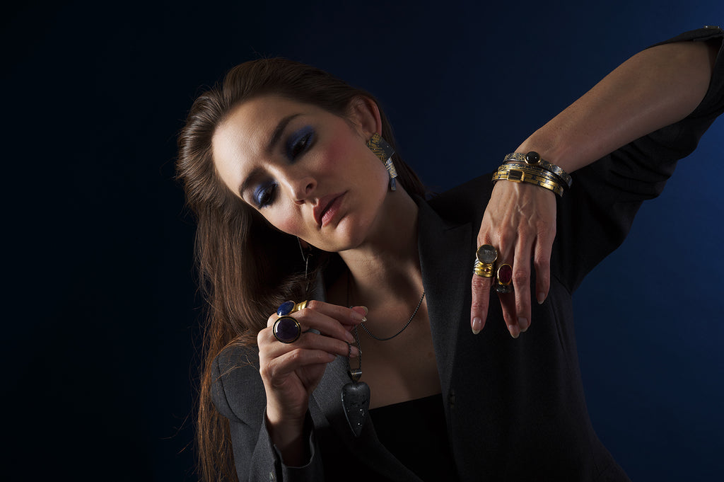 As shown with: Bezel Set Moonstone and Diamond Cuff, Square Drop Earrings with Diamonds, Faceted Tourmaline and Diamond Ring, Blue Sapphire Ring, Star Ruby Circular Ring, Munsteiner Cut Quartz with Byssolite Ring, Ashanti Cuff, and Silver Cuff with Diamonds.