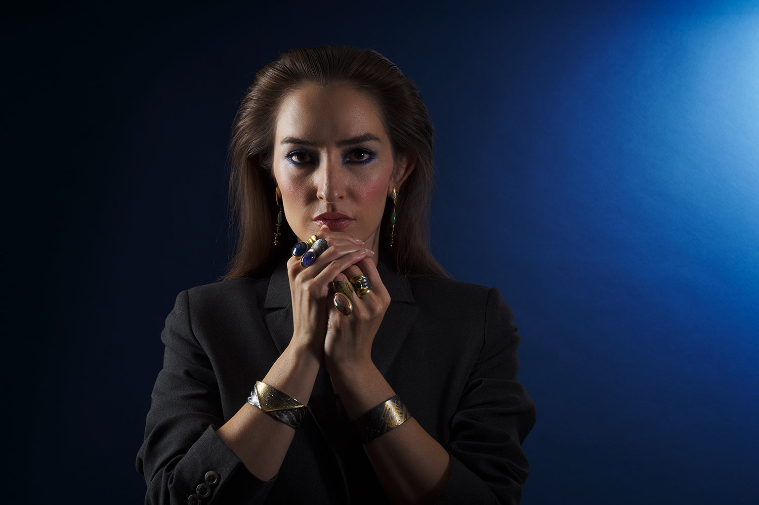 As shown with: White and Pink Diamond Cuff, Bezeled Green Tsavorite Ring, Tanzanite Dome Ring, Yellow Gold and Diamond Cuff, Jade Kite Earrings, and Blue Sapphire Ring.