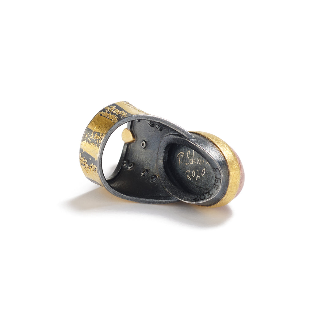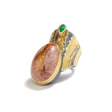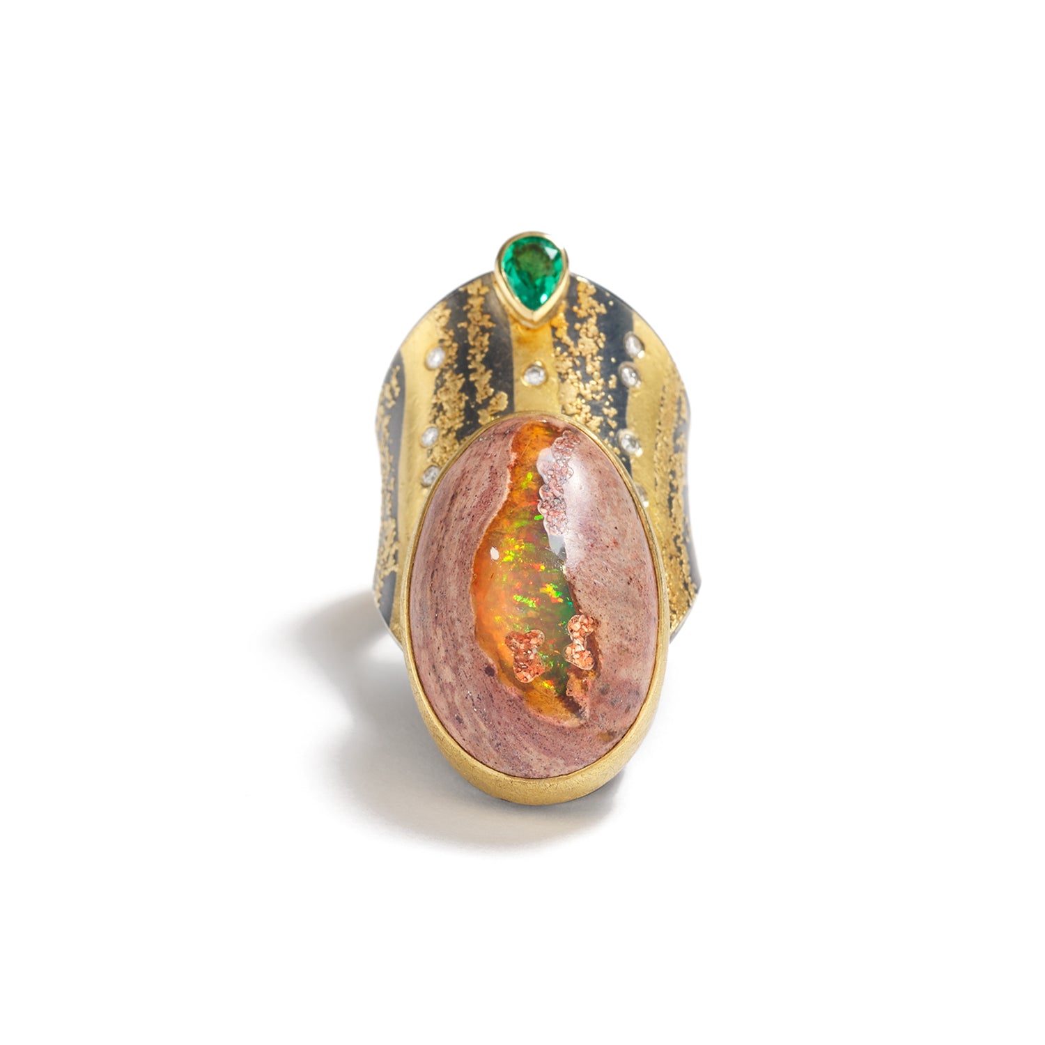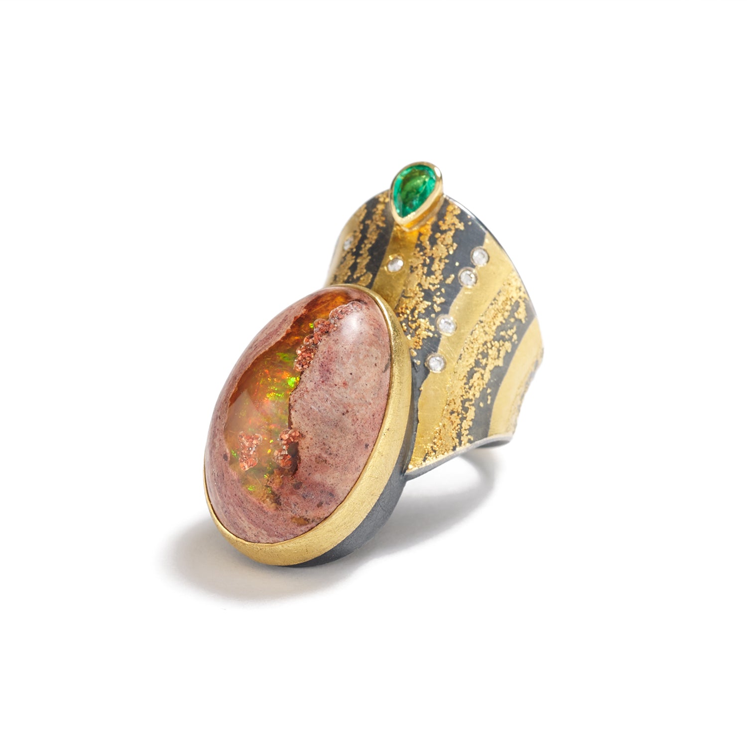 Oxidized sterling silver, 24K & 22K yellow gold, Mexican fire opal, emerald .33 cts, 8 white diamonds 0.08 cts total weight