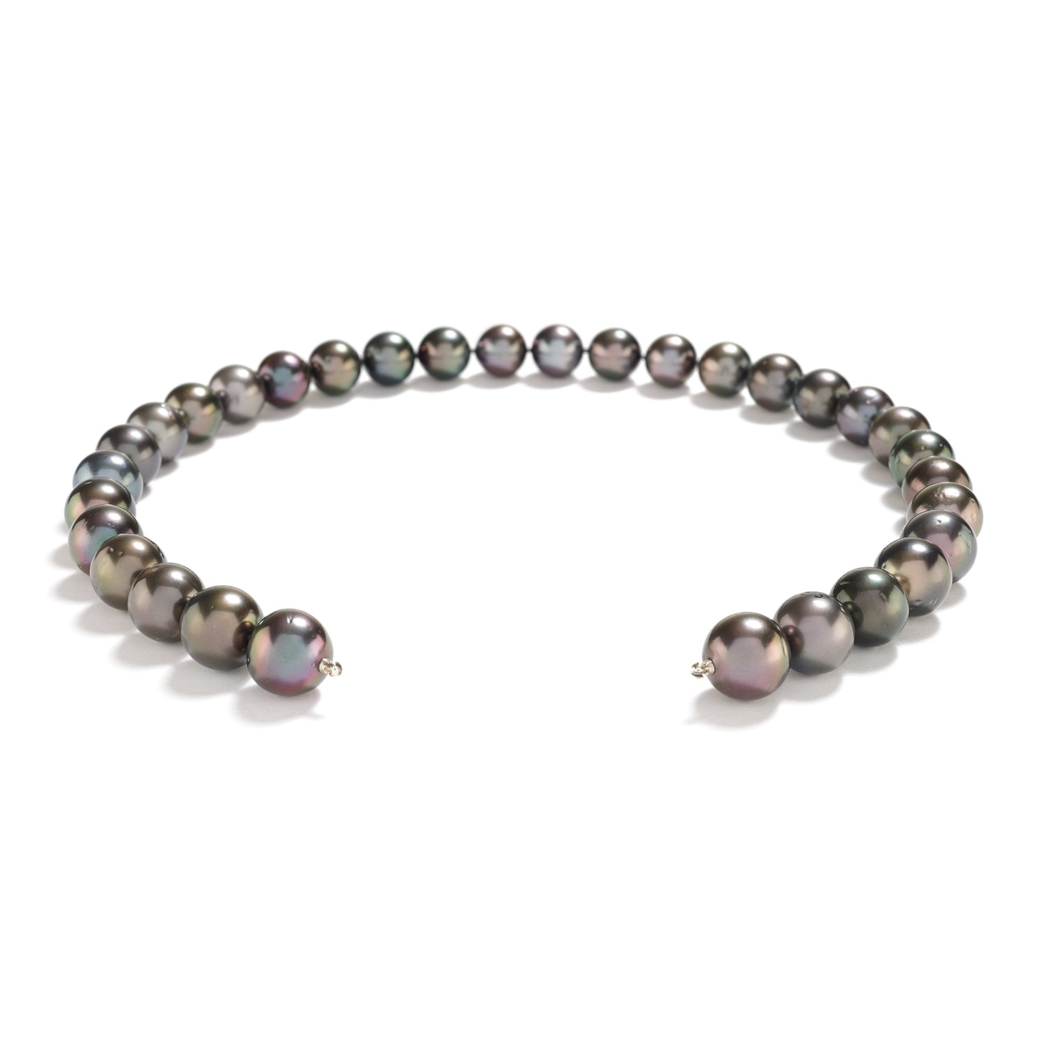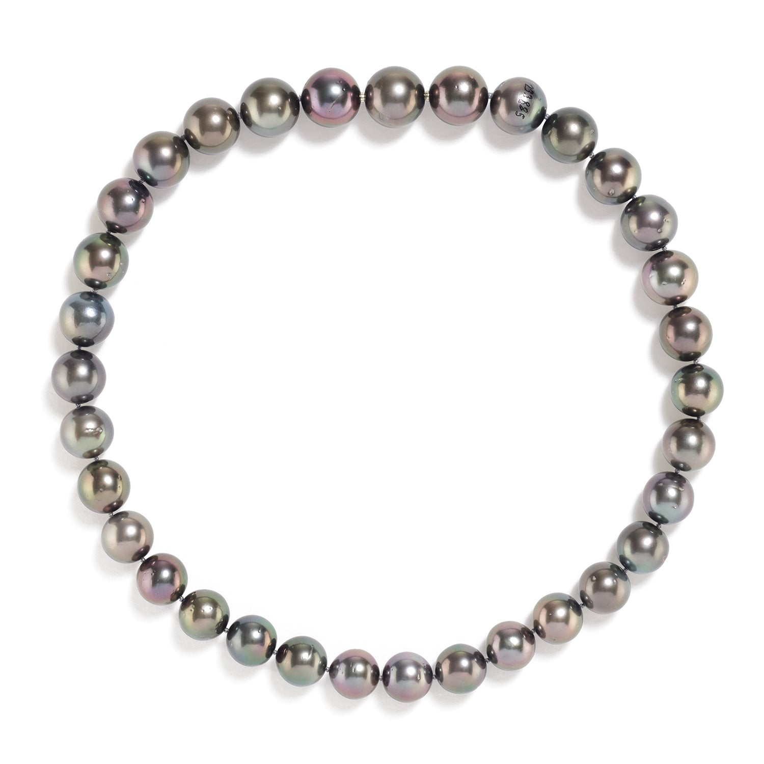 This strand of luminous pearls naturally radiates from the luster of the deep sea. 33 iridescent Tahitian pearls in remarkable hues of silver, rose, blue and brown evoke a myriad of emotion. One will notice the smooth glossy surface upon holding this stunning strand.