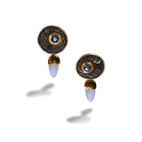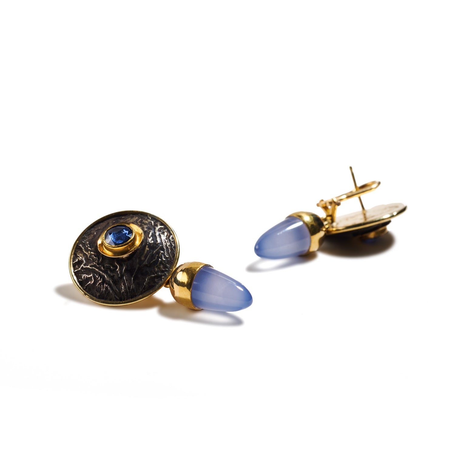 Upon a circular plane of textured silver and gold, exquisite rose – cut blue sapphires create an opulent treasure. Around their form, the makers carefully endow their shape with high karat gold, evoking a notion of movement. Securing the omega clip, the piece gracefully hugs the ear, keeping the head of the work engaged. Fashioned below is a floating sky blue chalcedony set in the graceful throws of gold. Elegantly the stones sway with every turn while capturing a glow with every surge of light.