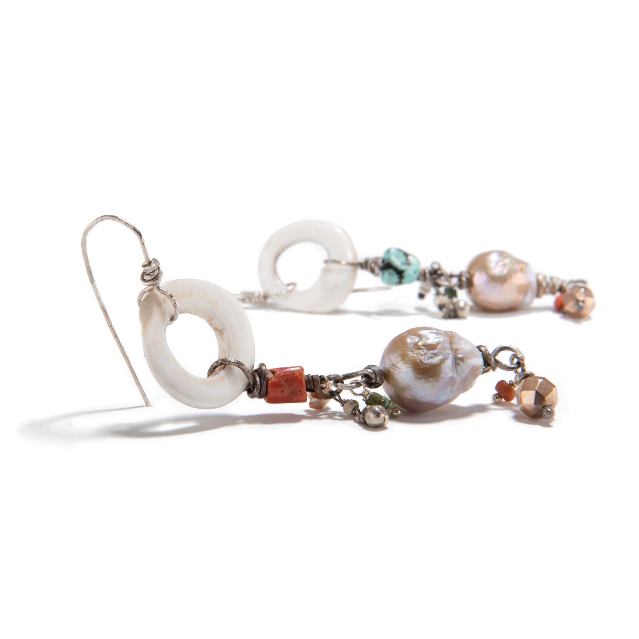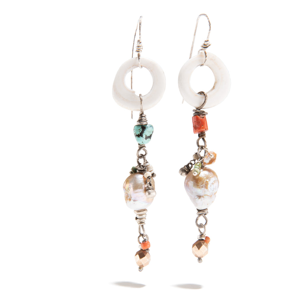 Sterling silver, antique silver, antique New Guinea shell, antique Tibetan turquoise, antique coral, pearls