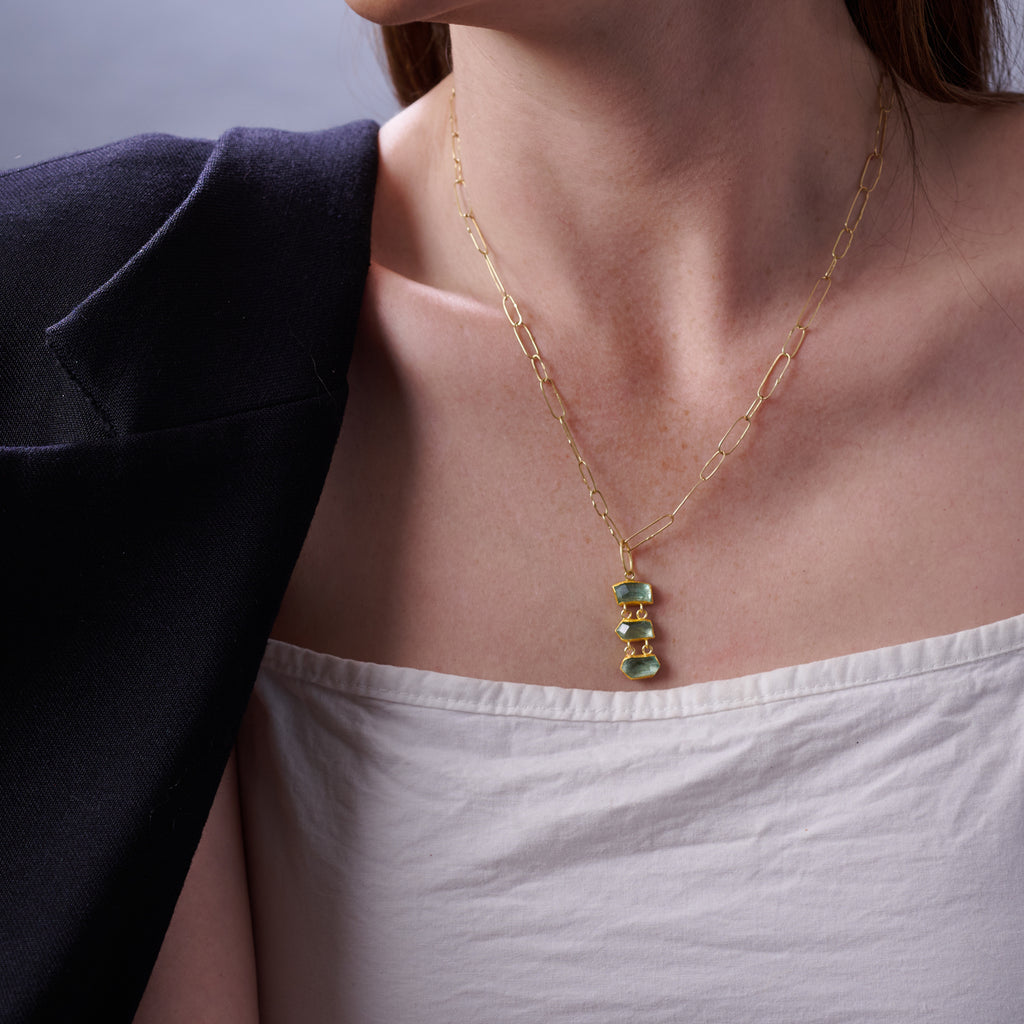 Three organically shaped green aquamarines glow with a soft, inner light, each one cradled in 22k gold. Delicate gold links connect the stones, giving the pendant an airy, graceful drop. It shines, but never shouts. Lightweight and understated, it pairs effortlessly with Petra Class necklaces for a layered, sculptural look.