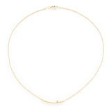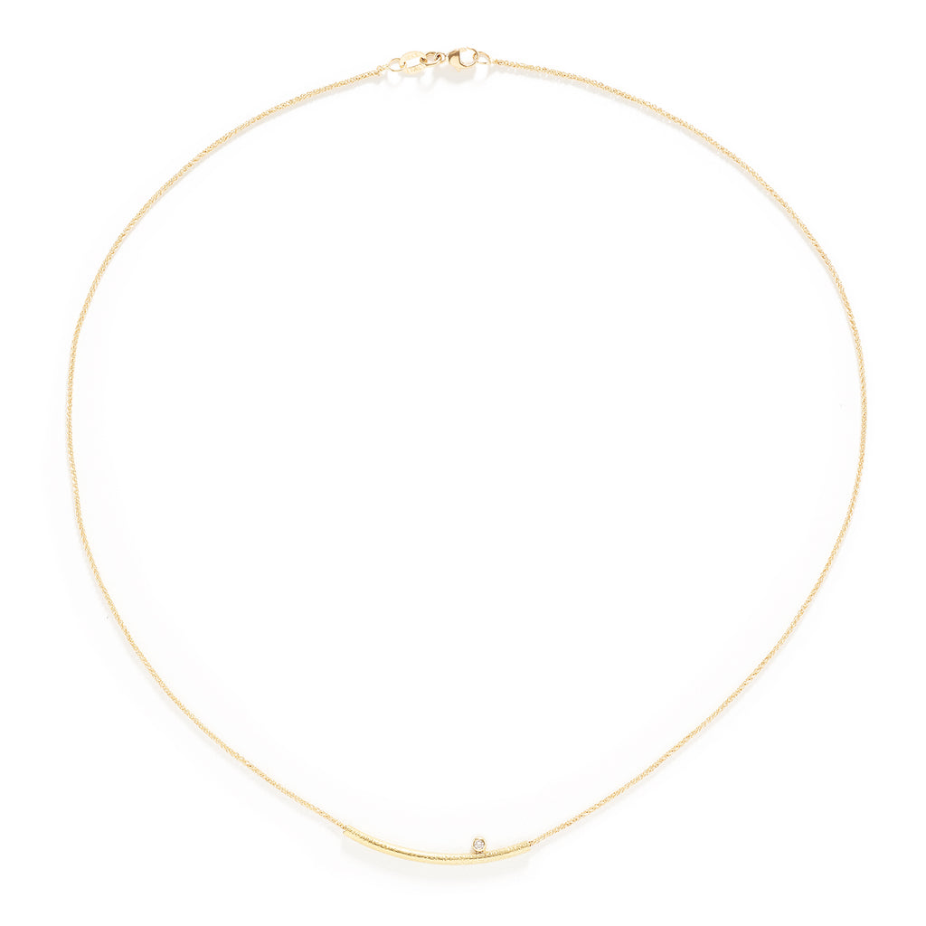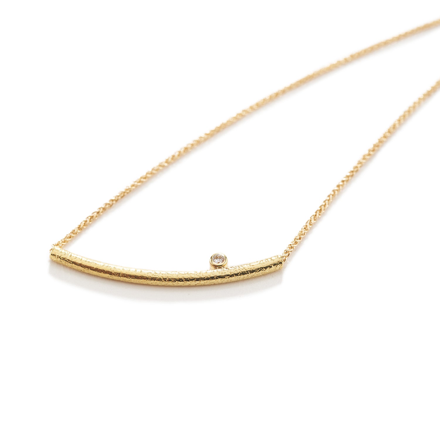 Barbara Heinrich creates a sweet and subtle statement that at the same time offers substantial variety. On a fine golden chain, she anchors her piece with a thin and textured bar of gold. Precisely placed on top is a diamond, perched asymmetrical to the bar, inciting further interest and intrigue. The artist presents a pleasant and wonderful complement that is soft enough for casual wear and still boldly stunning for your most stirring engagement.