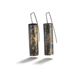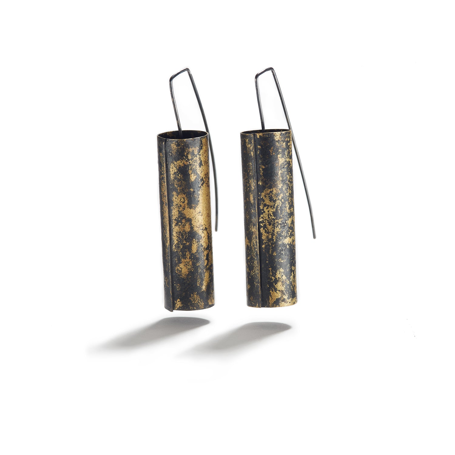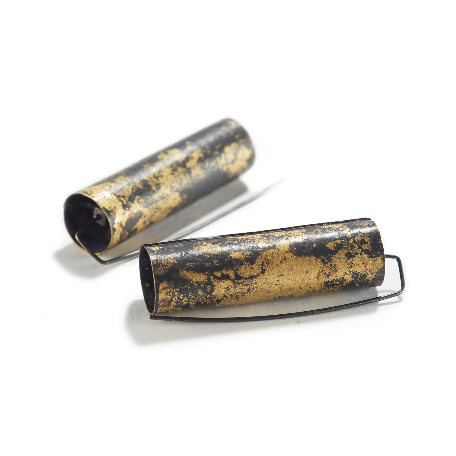 Suspended cylinder forms in multi-shaded bronze is a striking statement of subtle, yet luscious ingenuity. Line and shape collide in this edgy and chic expression, as Biba Schutz ignites the soul with a simple, yet dynamic statement. On the ear, the work is a near weightless fit, while a flattering sight to behold. At the touch of light, admire the piece's slender composition as its sleek body gleams in varying constitution. Masterfully, the piece works geometric interest with a mystery of color. Brilliantly, Schutz creates a piece of art deserving of endless fascination.