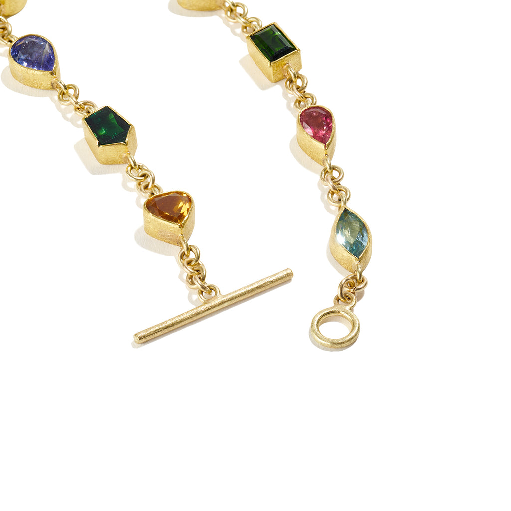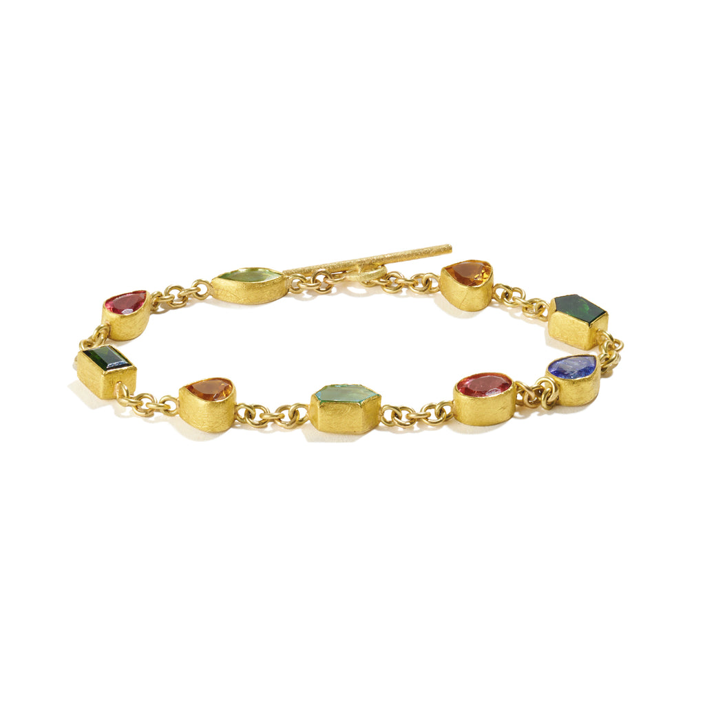Like a cascade of color captured in motion, Petra Class’s confetti bracelet scatters faceted aquamarine, tanzanite, citrine, and pink and green tourmaline across luminous strands of high-karat gold. Each stone glimmers like a spark of light, held together by petite golden links that allow the bracelet to sway with ease and rhythm. Finished with a refined gold toggle clasp, it combines security with sculptural elegance. Light and joyful, yet radiant with depth, this bracelet moves effortlessly from day to evening, perfect for daily wear or as a luminous accent for a special occasion.
