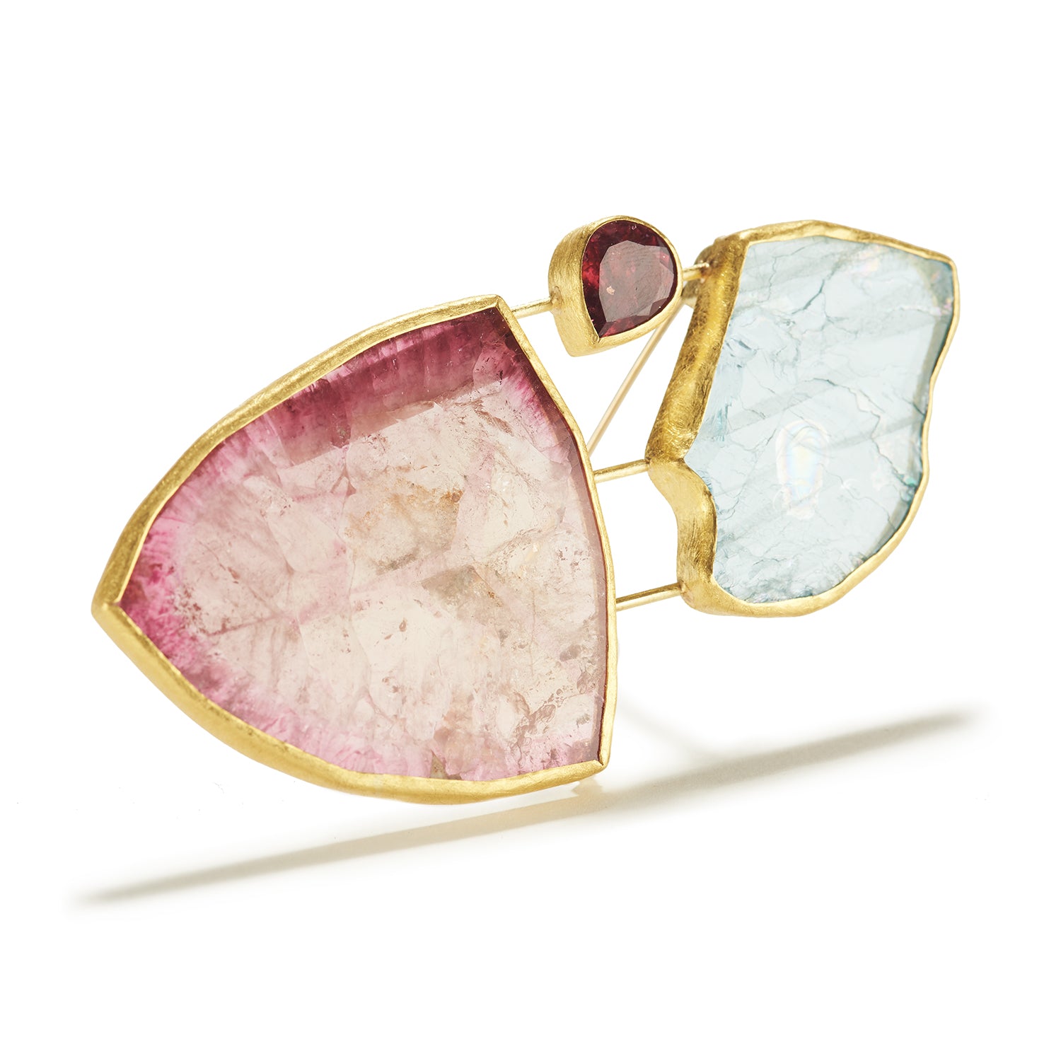 18K & 22K yellow gold, rough aquamarine 40 ctw, red tourmaline slice 60 ctw, faceted red tourmaline drop 4 ctw