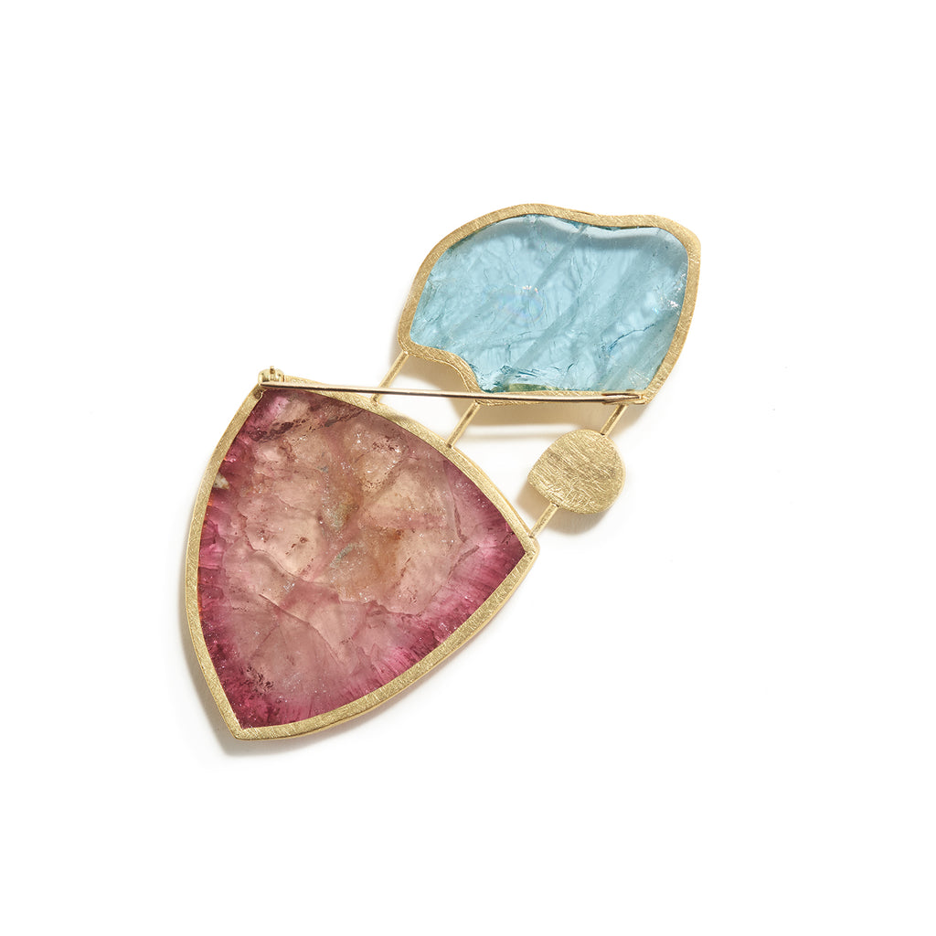 Luminescent vivacity is beautifully framed in the graceful embrace of high karat gold. Petra Class creates a piece beholden to the soft balance of shimmer and shine as rays of light emerge through the opulent bodies of rough aquamarine and tourmaline stone. To compliment this substantial composition, the artist imbues the piece with a gleaming, deep tourmaline drop, also in the careful hold of the precious metal. A wonderful demonstration of masterful and discerning craftsmanship. A tender, yet dynamic piece to ever satiate the soul.
