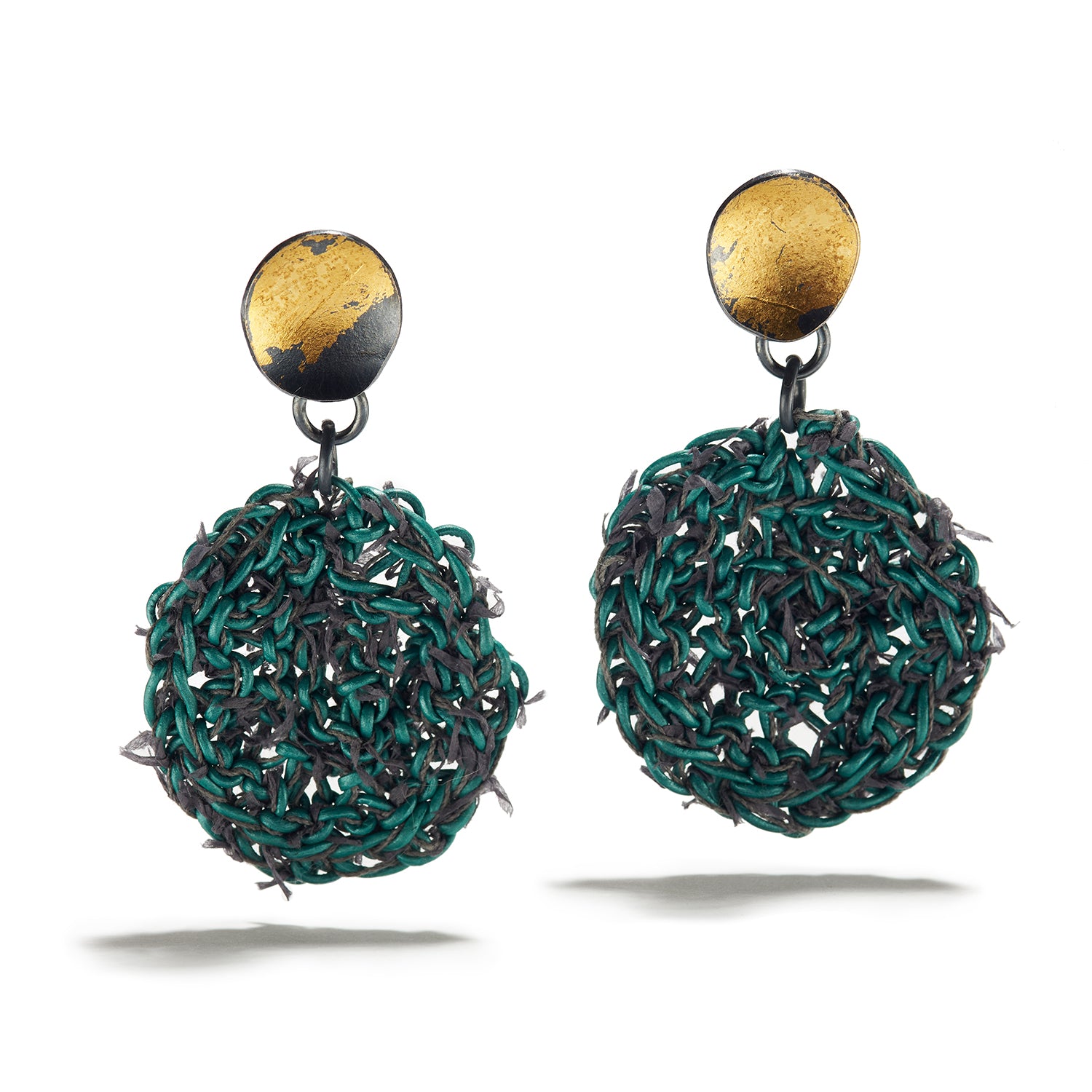 With extraordinary skill and creative ability, Swanson casts a web of crafted ingenuity. By hand, she knits teal leather to form a circular composition to gracefully fall from the ear. Within its lattice, sweet impressions of gray, Japanese fiber purveys her intricate work. Atop, undulating discs of darkened silver are brushed by the majesty of lustrous gold leaf, which bears the crown of the piece. From their throw, the composition delightfully sways in tandem with the body. On further glance, their textured surfaces leave us gazing in awe. A dynamic work, made with deviceful design, fit for every soul-stirring engagement.