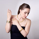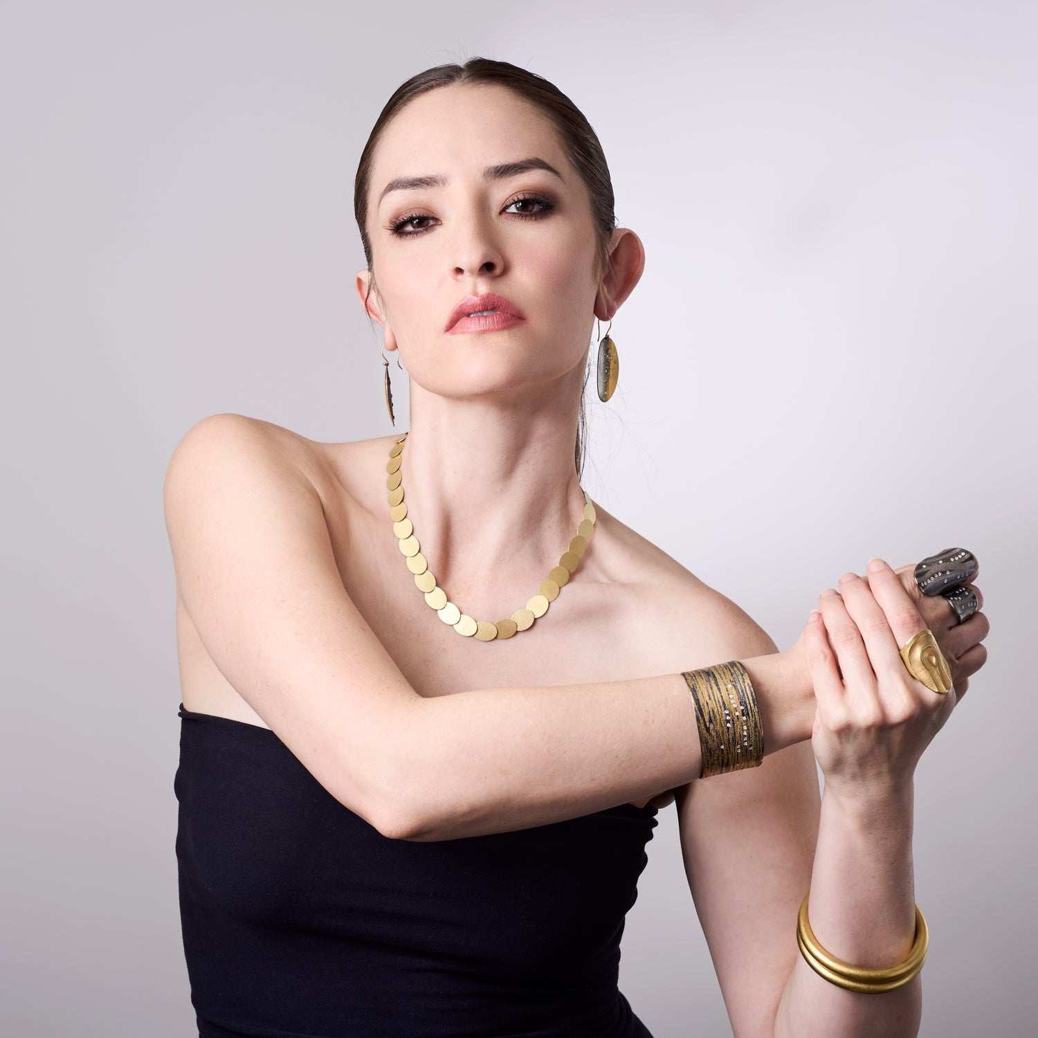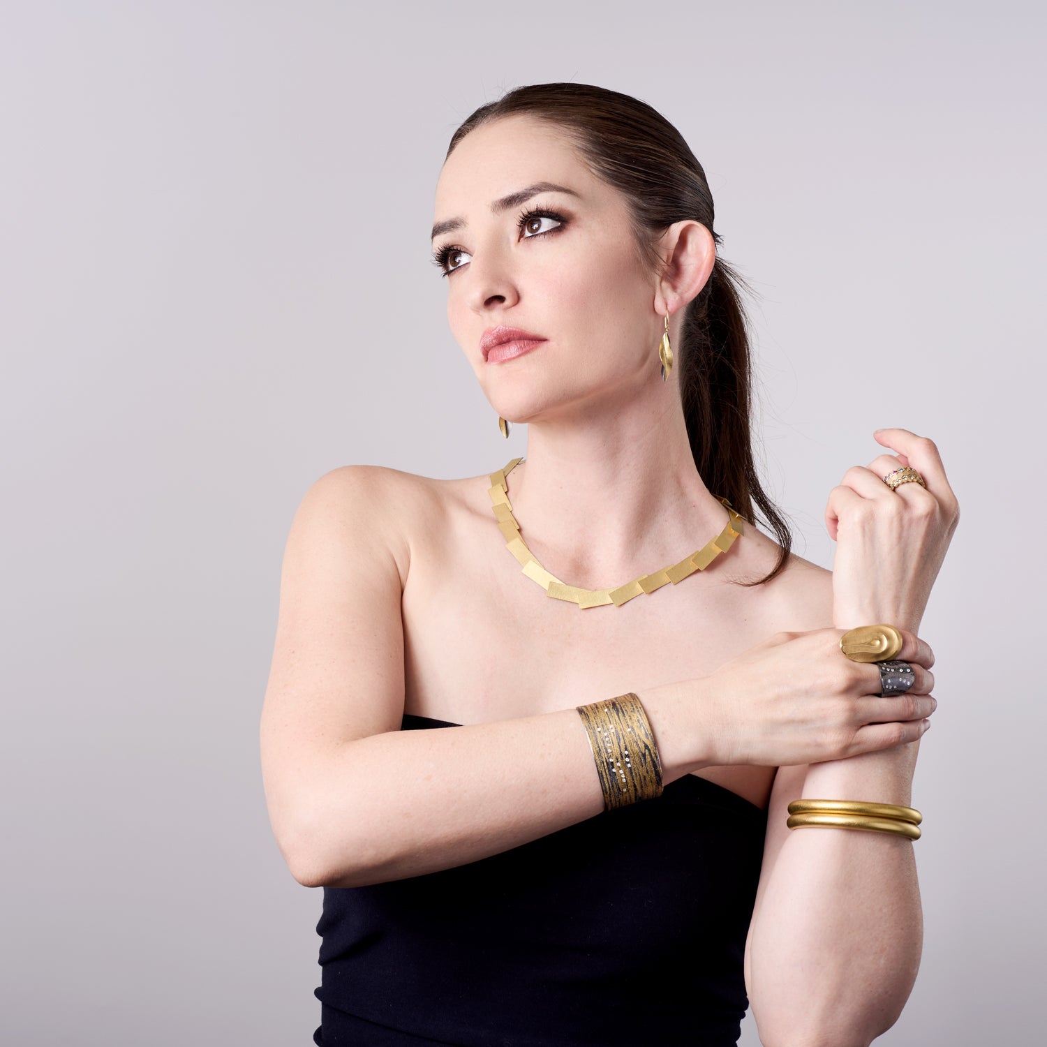 As shown with: Rectangle Treppenkette Necklace, Staggered Chain Necklace, Oxidized Silver Embrace Earrings, Oblong Disk Earrings, Platinum and Diamond Ring, Platinum Shield Ring, Gold Shield Ring, Hexagon Multi-Colored Sapphire Ring, Hexagon Light Green Sapphire Ring, Hexagons Ring, and Gold Eternal Bracelet ~ 8mm.