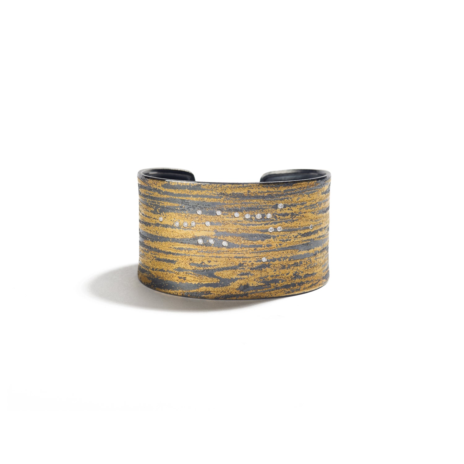 Oxidized sterling silver, 24K yellow gold, 19 white diamonds vsi 0.19cts total weight