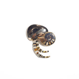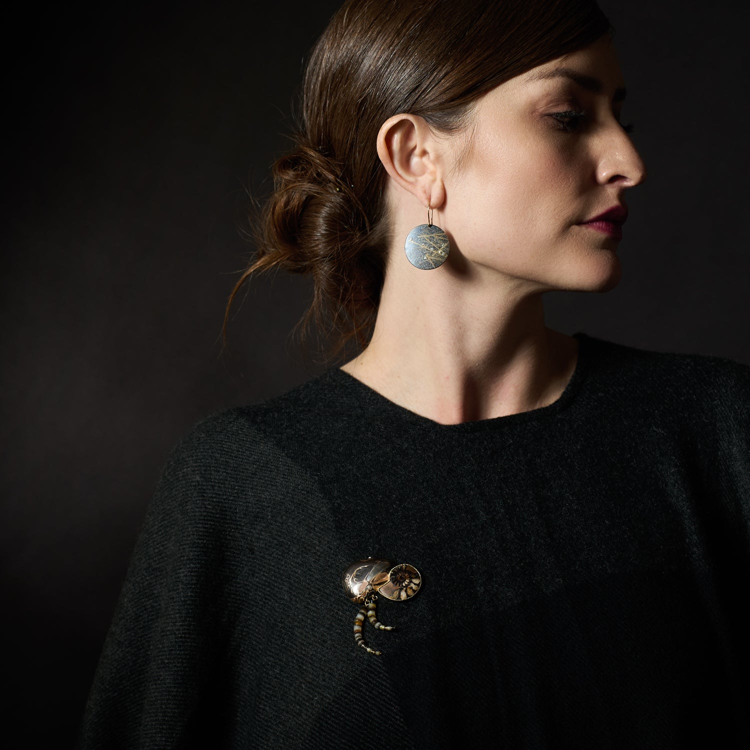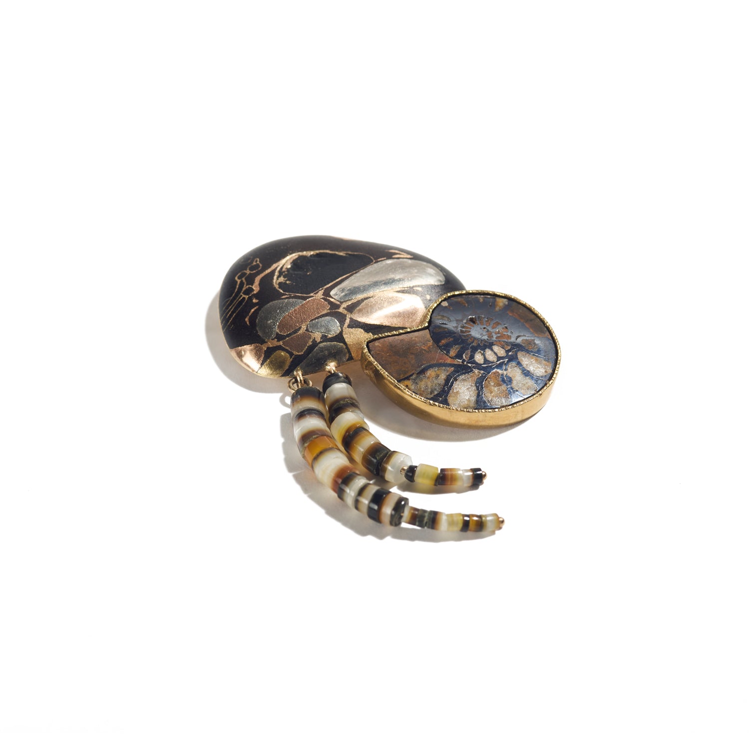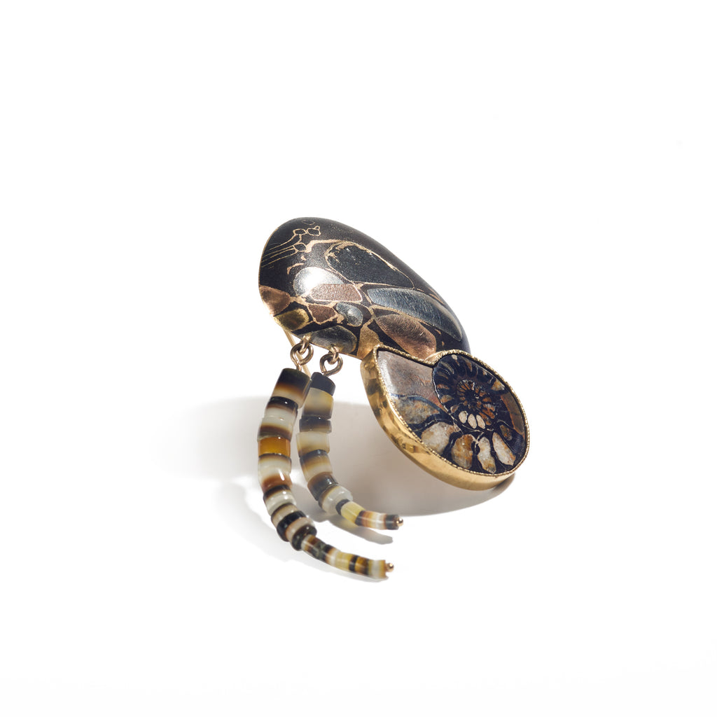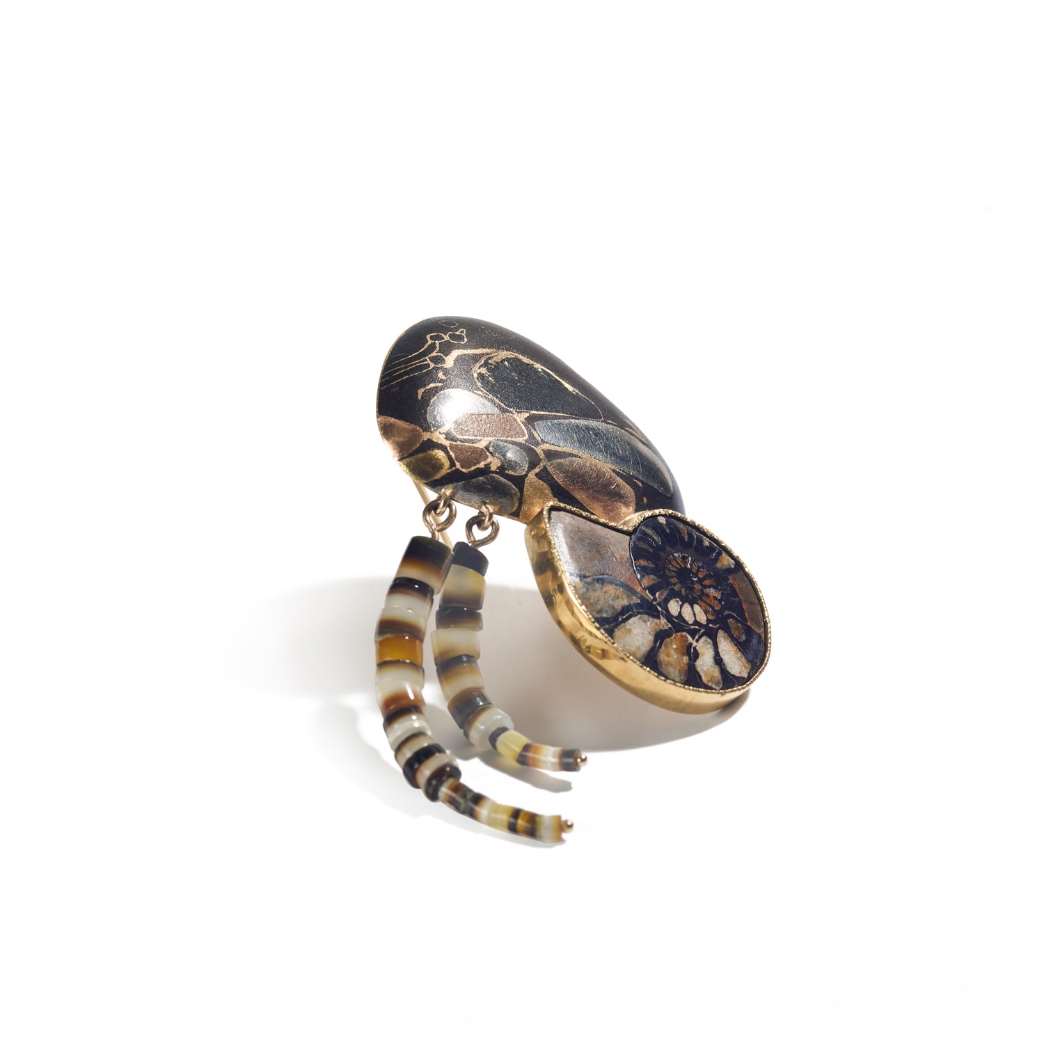 Shape and inspiration guide this brooch as Adell worked with the marriage of metals to mimic the natural beauty of the ammonite, in this one of a kind brooch. Agate beads arc the ammonite and bring this composition to its resting place.