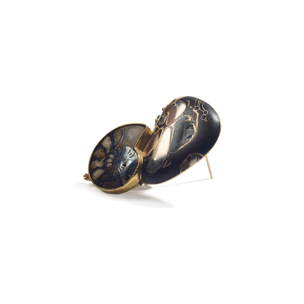 Inlaid 14K white, 18K red & yellow gold in shakudo, 18K yellow gold, fossilized ammonite, agate beads.