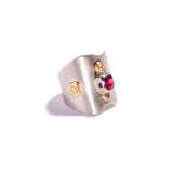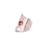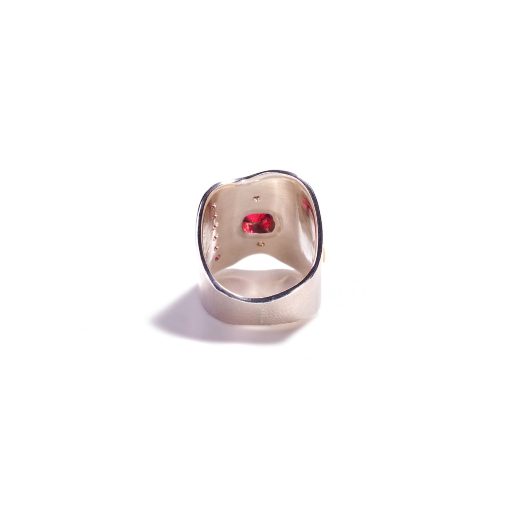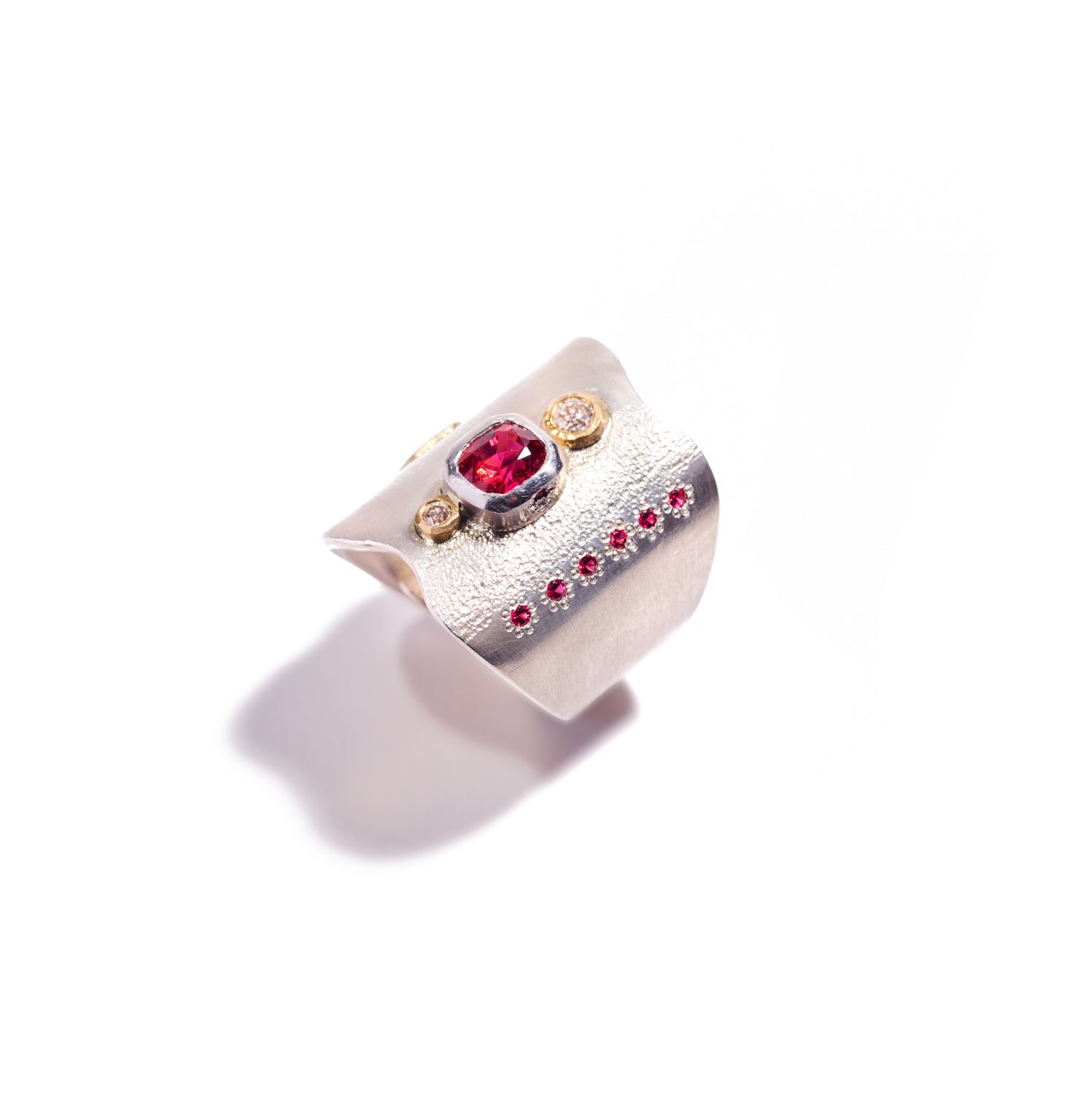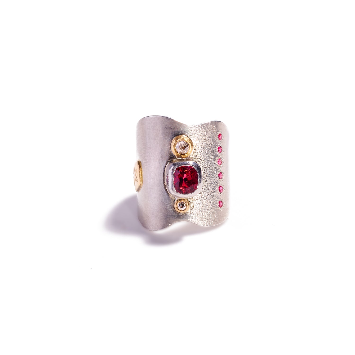 22K yellow gold, platinum, sterling silver, Jedi red spinel 0.80cts., two bezel-set antique diamonds, six faceted Jedi red spinel accent stones