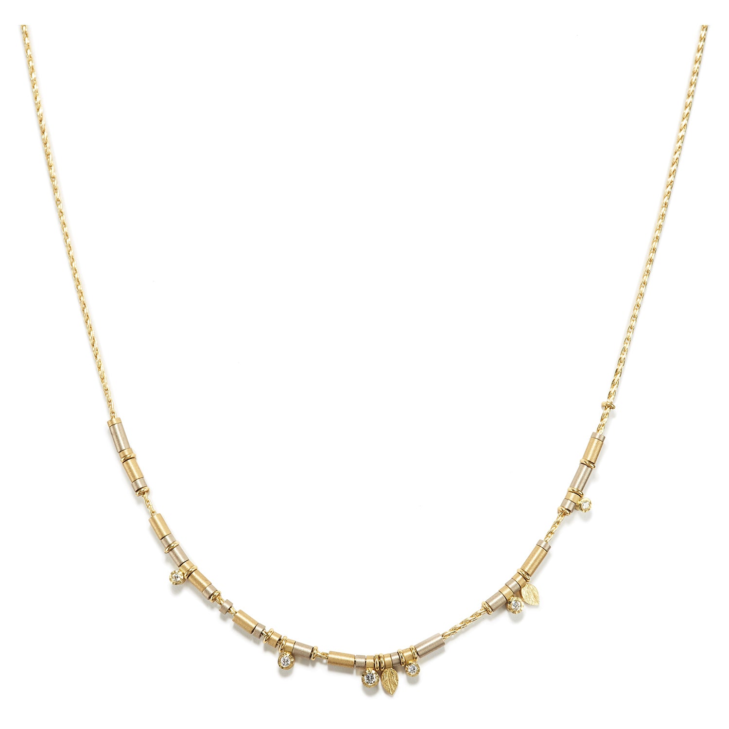 The delicate asymmetry of Rydmark's Diamond Drop Necklace is arranged with a balanced poise. Leaf charms in high karat gold lightly float in juxtaposition to the white and yellow gold tubing which compliments six rich diamonds, also enclosed within the precious metal. Subtle beauty in graceful design, this piece is meant to be enjoyed and adorned for any soul-stirring engagement.