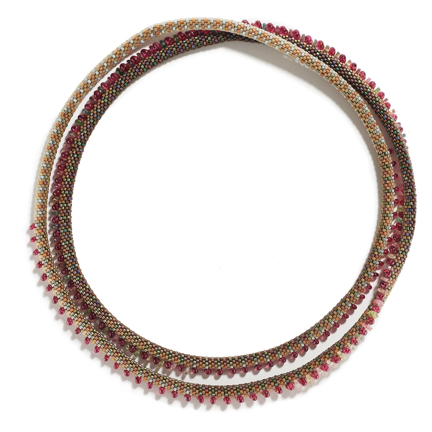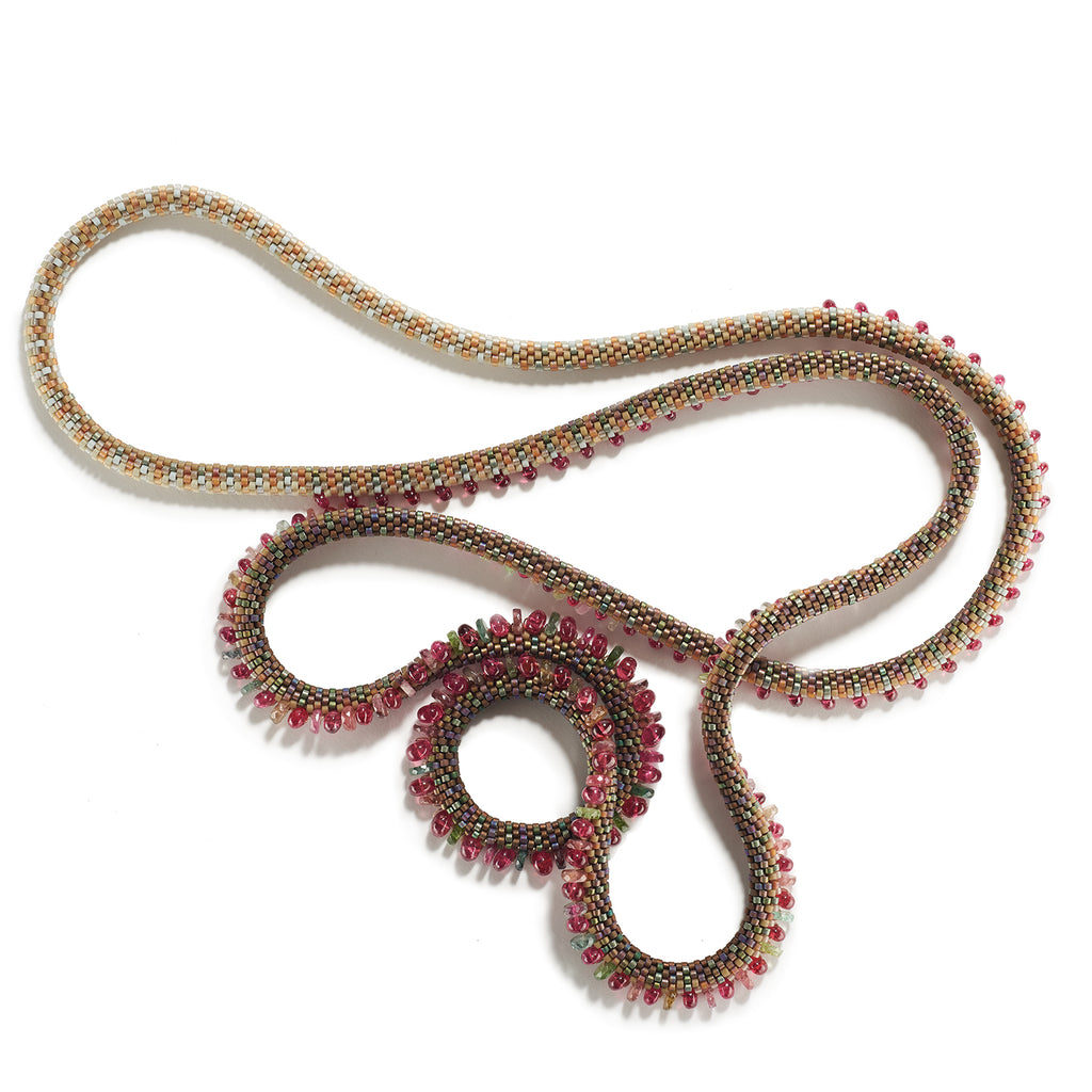 Soft streams of warm neutrals coalesce to the admirable intensity of bronze, metallic green, metallic blue and purple in this exquisite work of October by Claire Kahn. Skillfully, the maker sections off the composition into three expressions to best facilitate her intended design. Pure patterned neutrals are progressively superseded by the piece's darker palette. At first, Kahn graces the necklace with graduated tourmaline in a rich, dramatic pink. Reaching the heart of the work, she endows its lustrous outer perimeter with pale pink, yellow, green and blue tourmaline slices to satisfy a pleasing spectrum of color. An exceptionally intricate and versatile work to behold, on the body its marvelous splendor becomes the object of endless infatuation. Quite a palpable delight as we celebrate the beginning of fall in October's autumnal serenity.