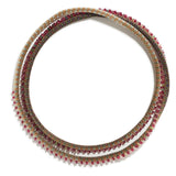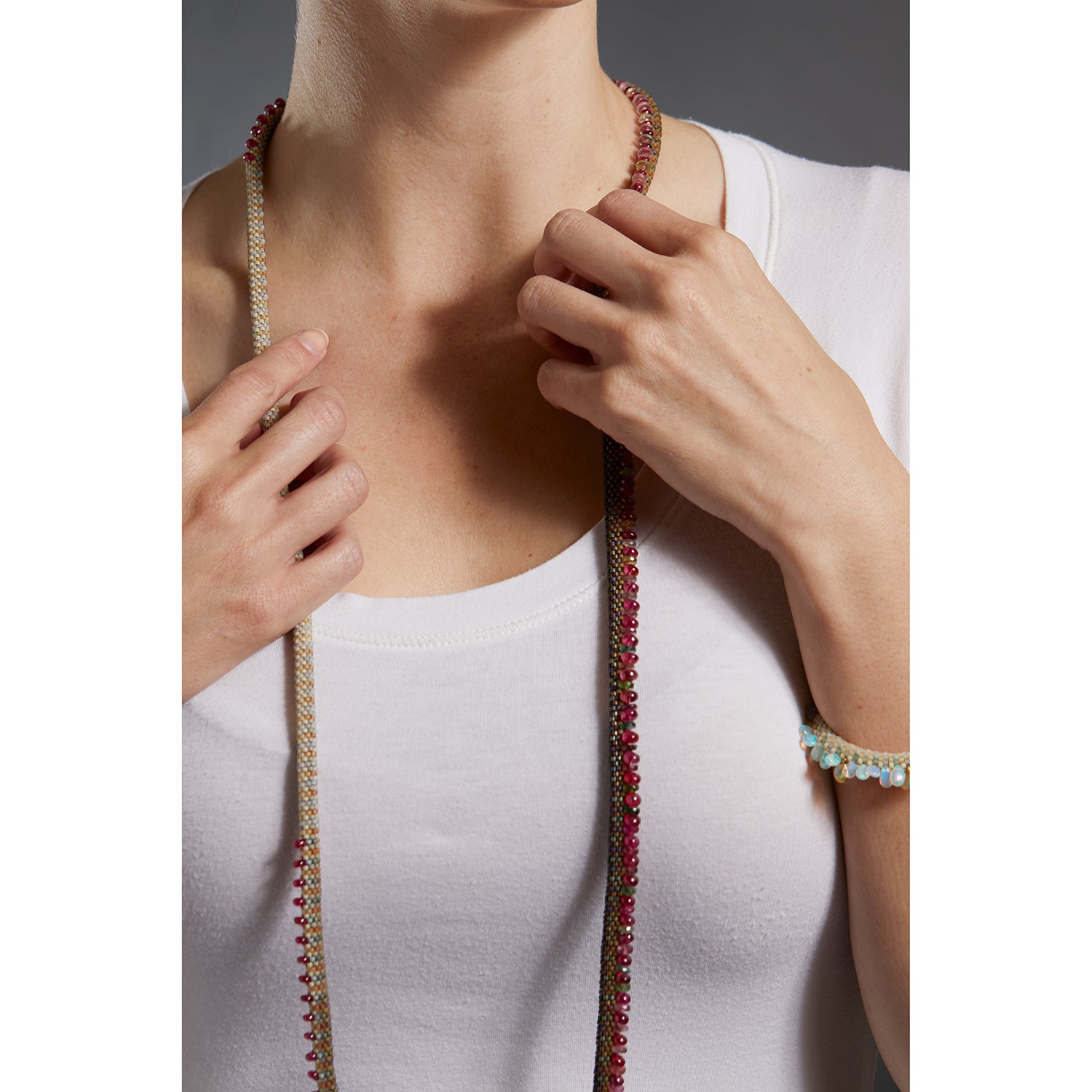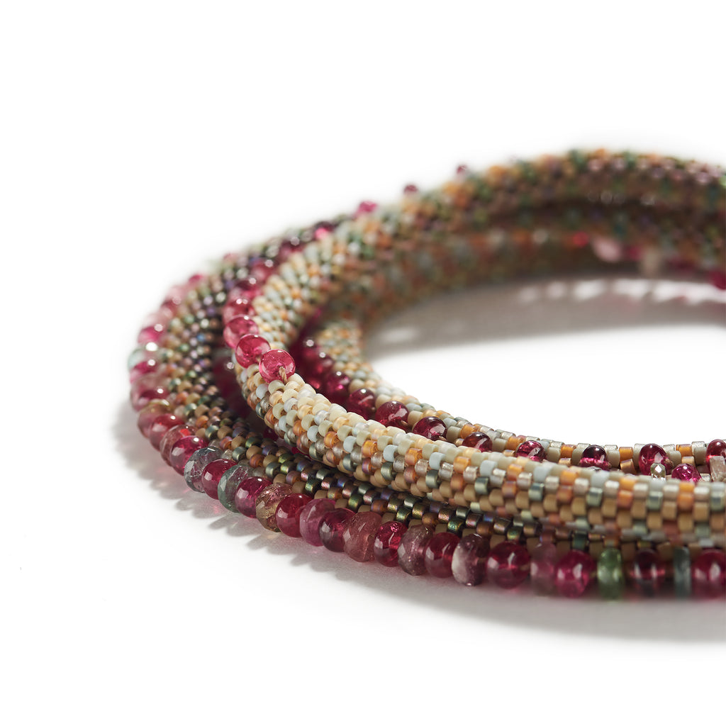 Cylindrical glass beads with segmented line of graduated tourmaline (rubellite) rondelles progressing to rubellite rondelles, alternating with multi-colored heishi tourmaline slices