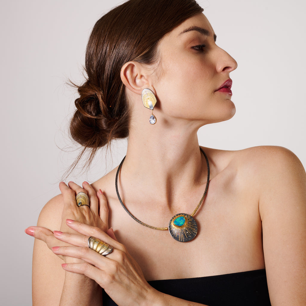 As shown with: Rainbow Diamond Ring, Knitted Oxidized Silver And Gold Necklace, Blue Diamond Ring, and Boulder Opal Earrings.