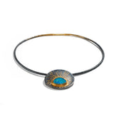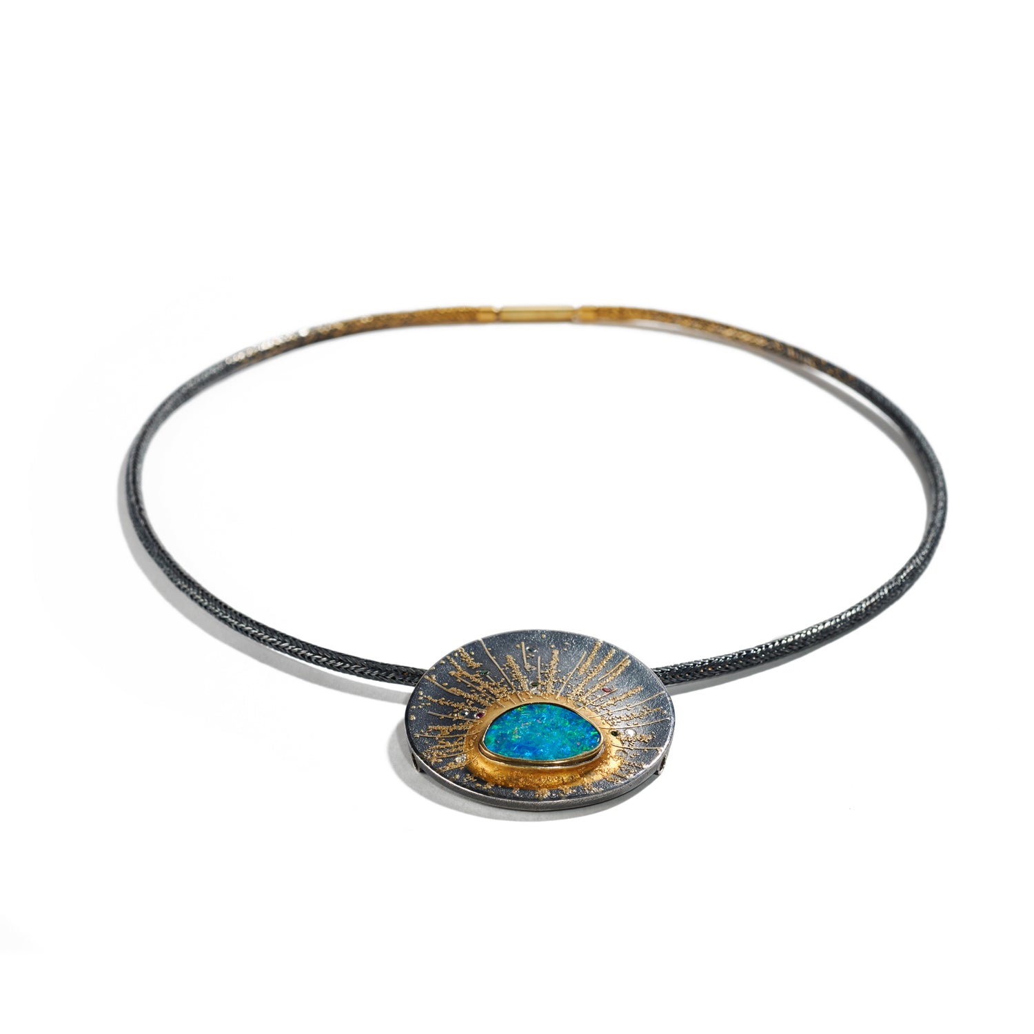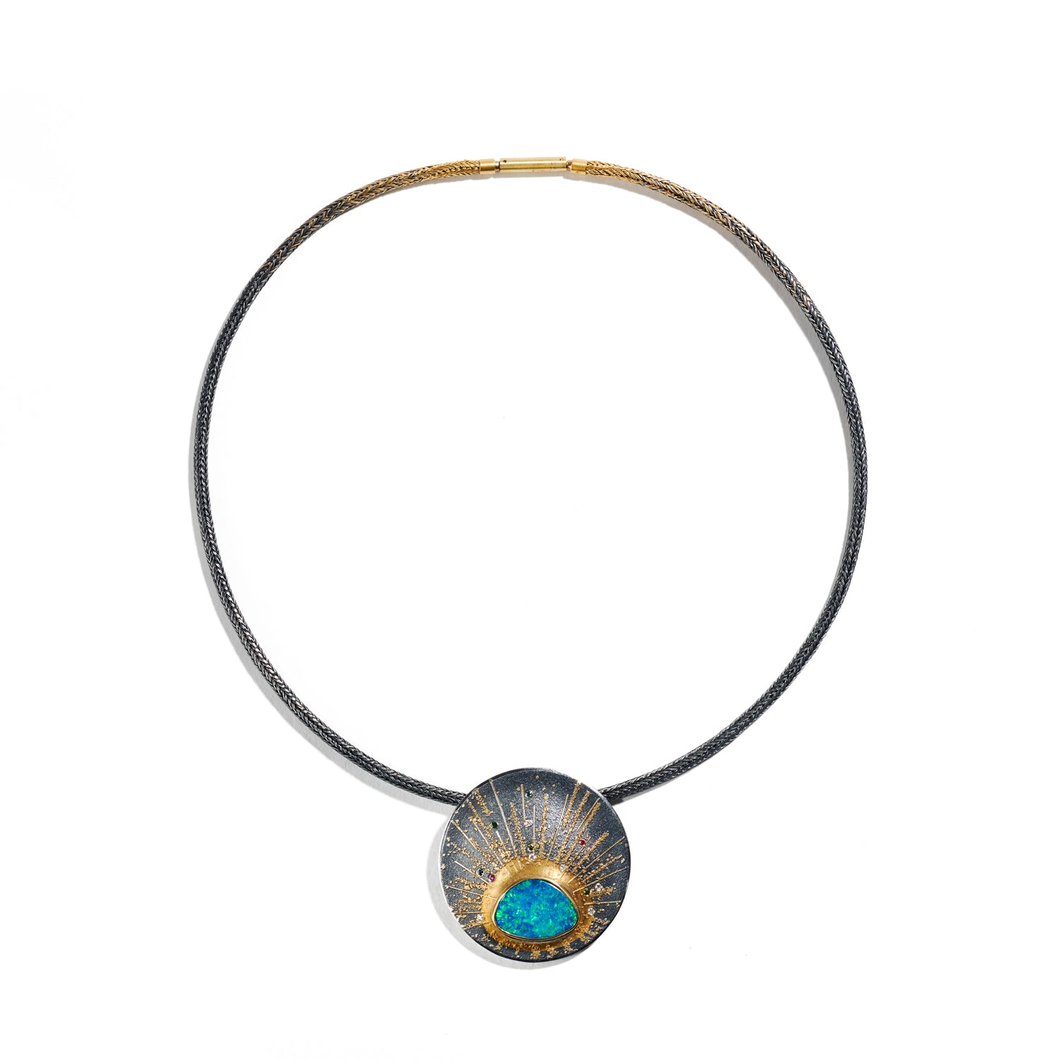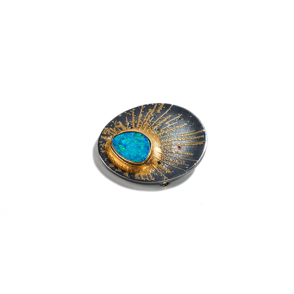 24K & 22K yellow gold, oxidized sterling silver, bezel-set boulder opal 5.8cts, 6 faceted champagne VS1 diamonds, 2 faceted pink VS1 diamonds 0.02cts, 2 faceted blue VS1 diamonds 0.02cts, 2 faceted green VS1 diamonds 0.02cts