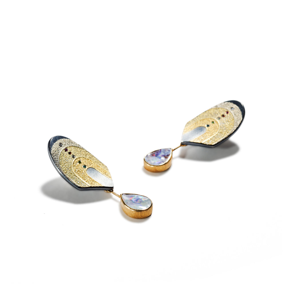 24K & 22K & 19K & 12K yellow gold, oxidized sterling silver, bezel-set boulder opals 8.20cts, 12 faceted diamonds 0.12 total carat weight