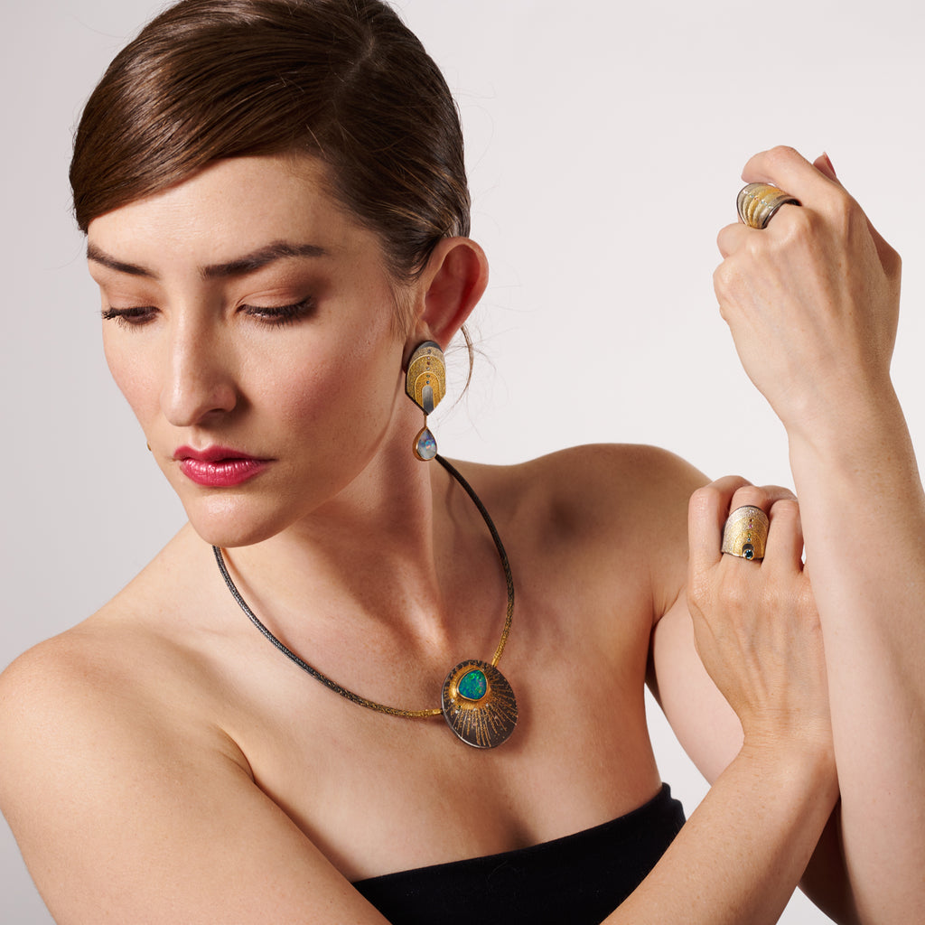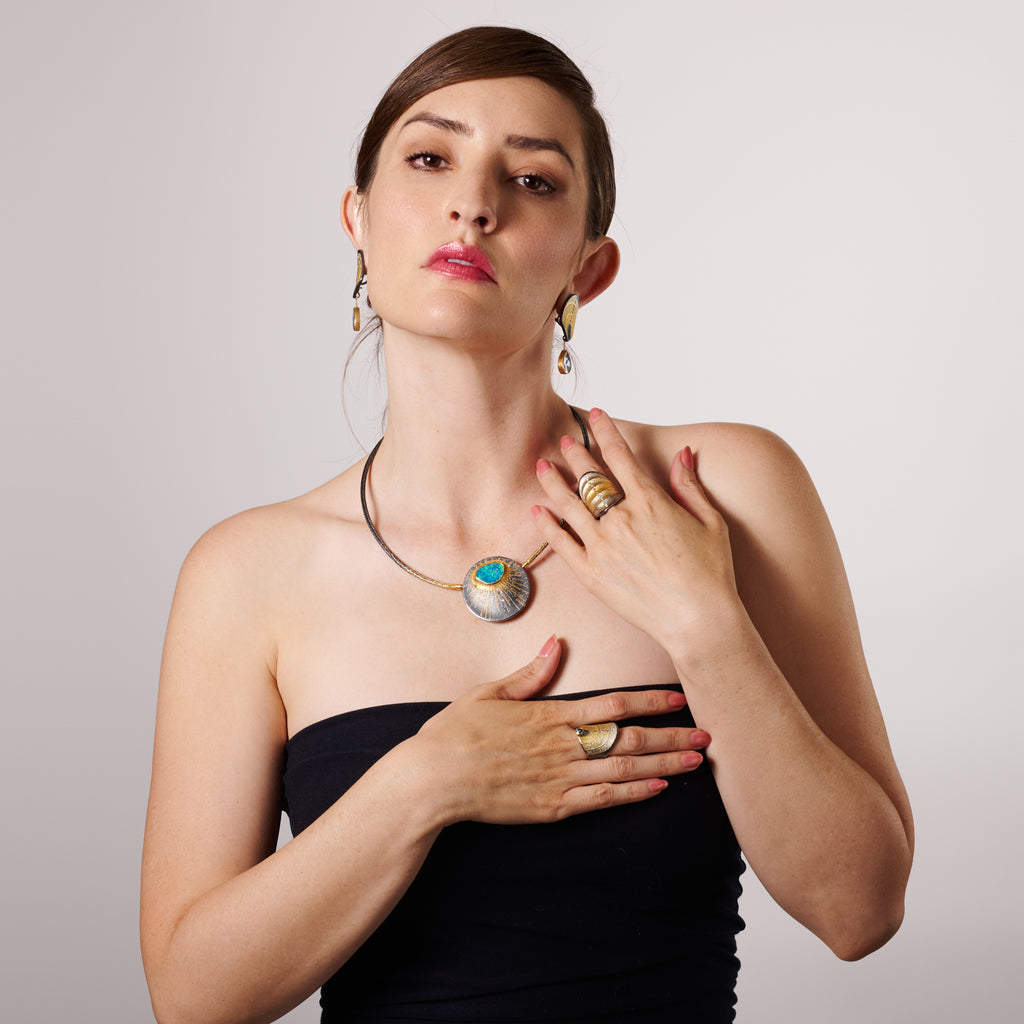 As shown with: Aurora Borealis Pendant/Clasp, Knitted Oxidized Silver And Gold Necklace, Rainbow Diamond Ring, and Blue Diamond Ring.