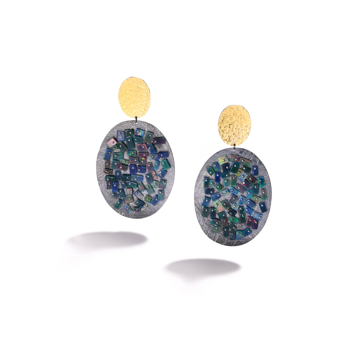 Ethiopian opal slices flash a rainbow of colors against deeply oxidized sterling silver ovals featuring our signature carved texture. The stones are pinned by hand to the ovals one at a time, and are suspended from disks of 22k and oxidized sterling silver bimetal with a hand hammered finish. With the deep primary hues of black Ethiopian opal, the colors shift in these post earrings as the wearer moves.