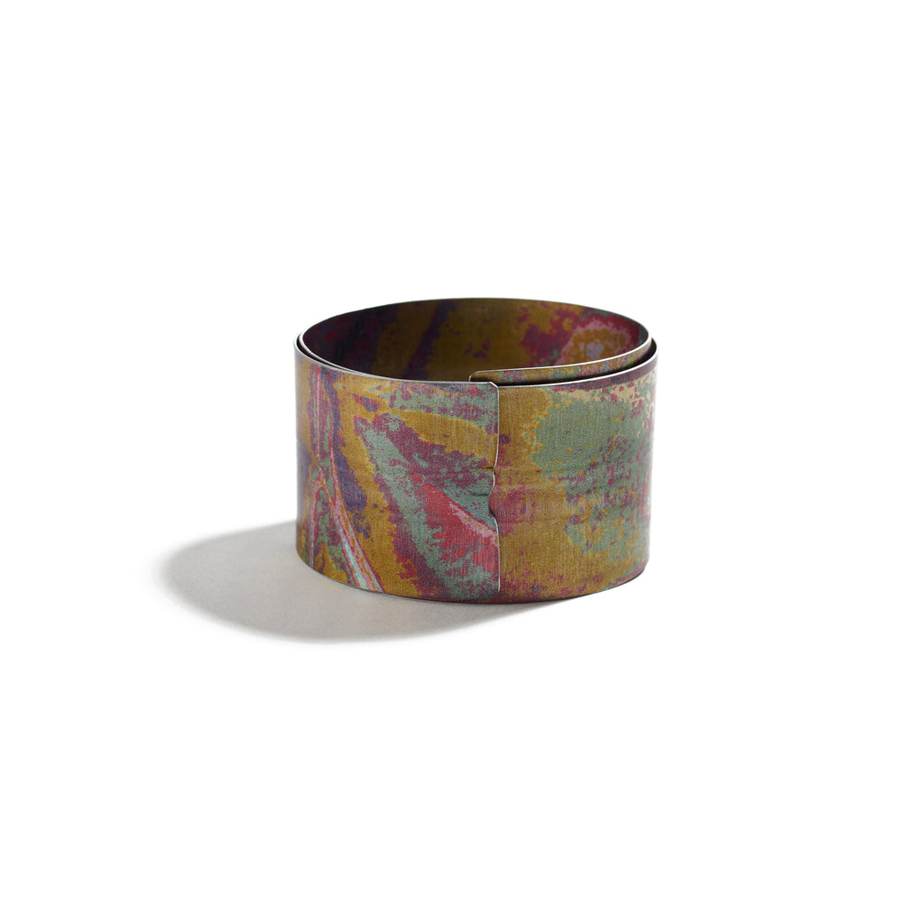 Undergoing the process of creating an exceptional, durable finish, Jane Adam artfully constructs exquisite works of art from aluminum. The finishing result is a complexity of color that exudes vibrancy and eloquence upon the body. Lightly, one may tug at the form to expand and pleasantly pull the piece over the hand and around the wrist. Resembling a near hourglass shape, the piece is an elegant fixture as it gracefully wraps itself in place. Quite a fine expression of soul-stirring adornment.