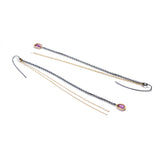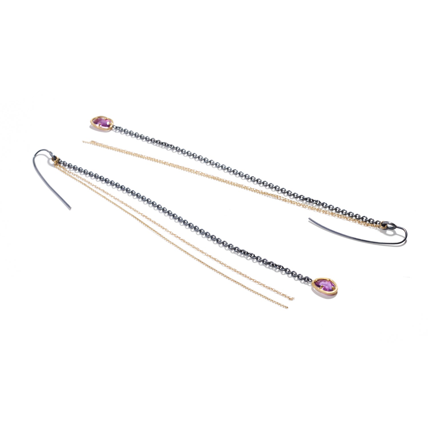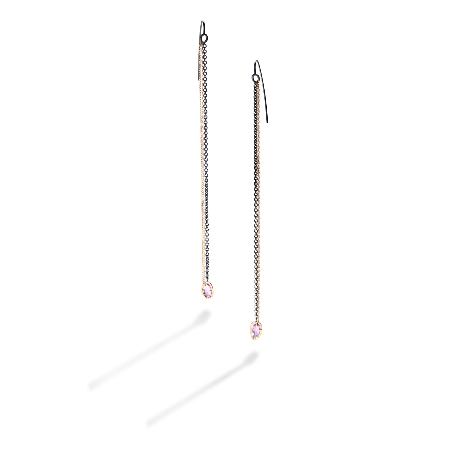 Latondra Newton creates earrings that are an exquisite fusion of elegance and bold artistry. The juxtaposition of two high karat gold chains and one oxidized sterling silver chain create a striking contrast that enhances their modern yet timeless appeal. At the heart of each earring is a luminous faceted amethyst, known for its enchanting pink and purple hues. The amethyst are gracefully suspended from delicate cascading links, allowing them to sway effortlessly with movement, grazing the shoulders with every turn.