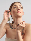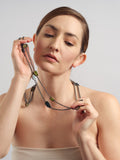 This long sterling silver necklace is a striking blend of modern elegance and organic asymmetry. Crafted from sterling silver chain links, it drapes fluidly, designed to be worn as a single strand or layered for added dimension. Twelve asymmetrical peridots, each encased in a warm bronze bezel, are spaced throughout the length of the necklace. Their irregular shape creates a natural, unstructured rhythm, while the vibrant green of the peridots contrasts beautifully against the cool silver and rich bronze. The combination of mixed metals and the gemstone’s lively hue gives the piece a refined yet earthy appeal—perfect for those who appreciate understated luxury with a touch of the unexpected.