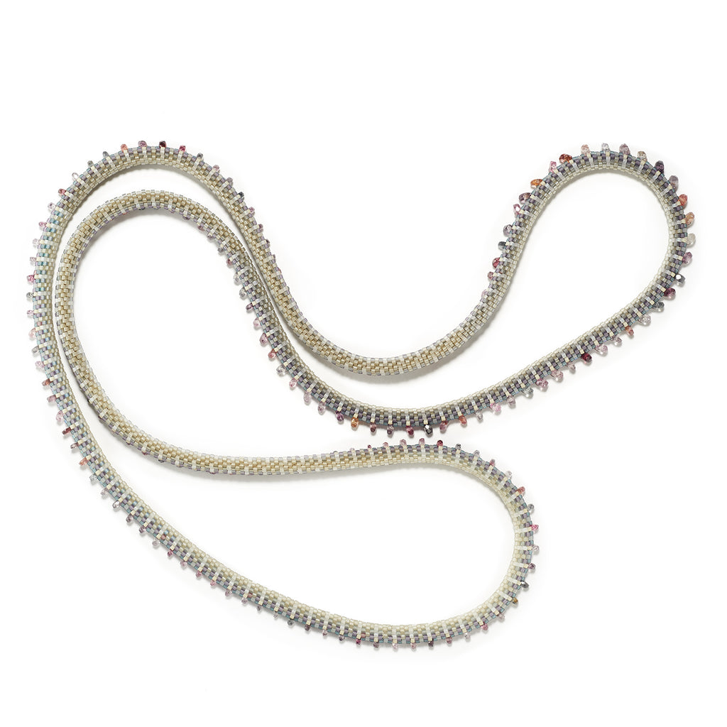 Purple and Gray Sapphire, Folon pattern in white, light and dark gray and pale violet, with a line of graduated, faceted sapphire rondelles, in clear, gray, pink, red and purple.