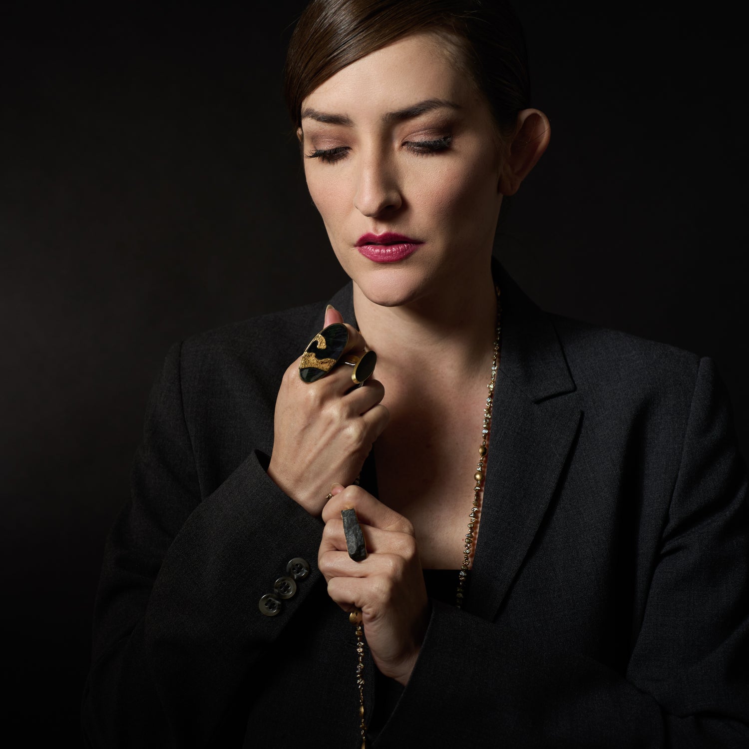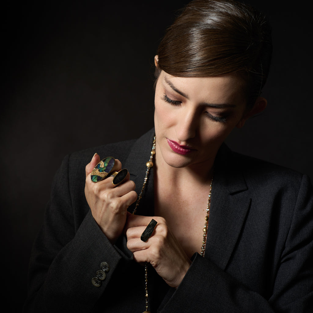 As shown with: Lariat Freshwater Pearl Necklace with Touchstones, Spectrolite Ring with Gold, and Spectrolite Ring with Gold II.