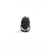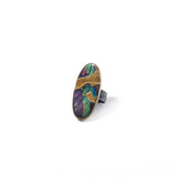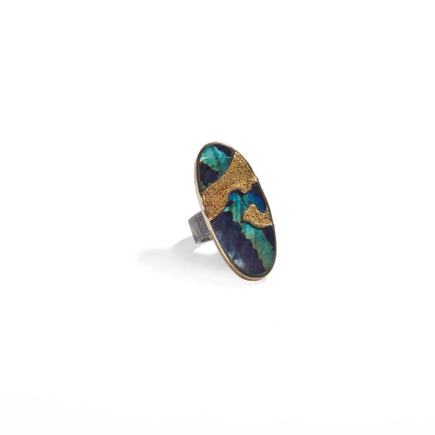 A river of gold granulation runs through carved spectrolite in this ring of fascination and feat.