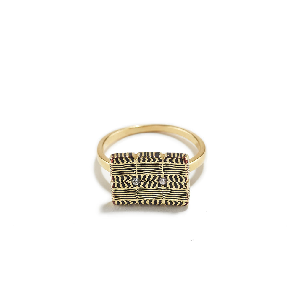 An exquisite work by NaMu Cho. The artist employs Japanese shakudo and high karat gold to compose an expression of exotic intrigue and intoxicating elegance. At the core of the work, Cho pulls the gaze to its darkened, animated eccentricities, which dance upon their precious frame. Its slight, undulated form gleams as it reflects light that sits upon its surface. Dazzling diamonds emerge from the vivacious ensemble set before us. Though their unending glimmer continues to shine, the masterful maker yet humbles the piece with subtle grace by the way of sheer, brilliant design. The fine band smoothly wraps itself around the finger for pure comfort once worn. Cho creates a fitting work of adornment, eager to awaken the soul.