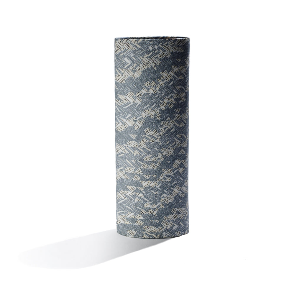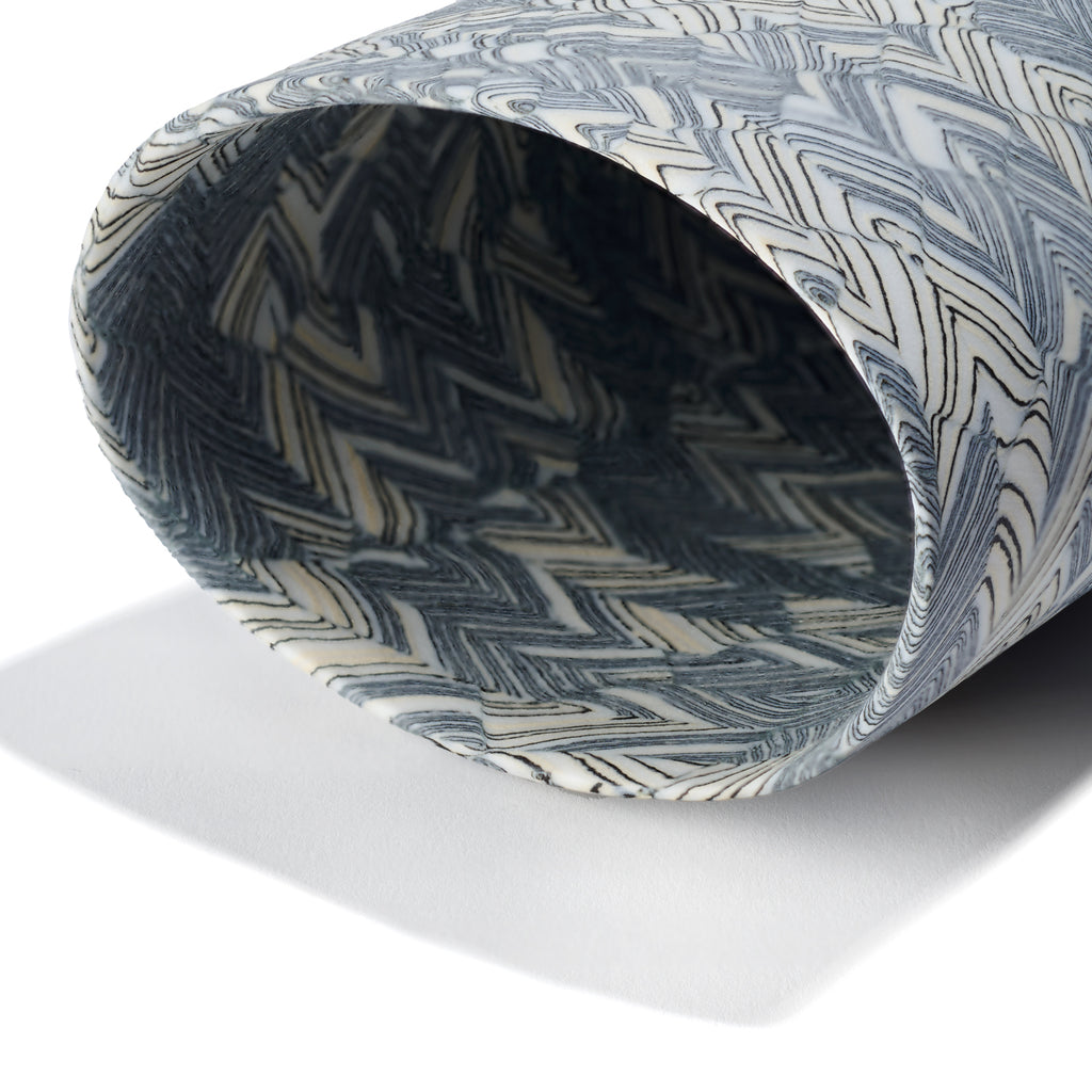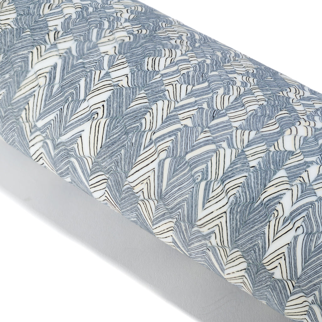 A striking interplay of black, cream, and white tones, this piece showcases the masterful work of Pottinger. Layers of colored clay are carefully assembled and sliced to form intricate, flowing patterns that wrap around the vessel’s curved form. The elongated, elliptical shape adds a dynamic sense of movement, while the muted palette grounds the piece in a quiet elegance. Each line and curve reflect Pottinger’s deep precision and control over both form and material. A sophisticated work that balances visual complexity with serene minimalism, rewarding close inspection from every angle.