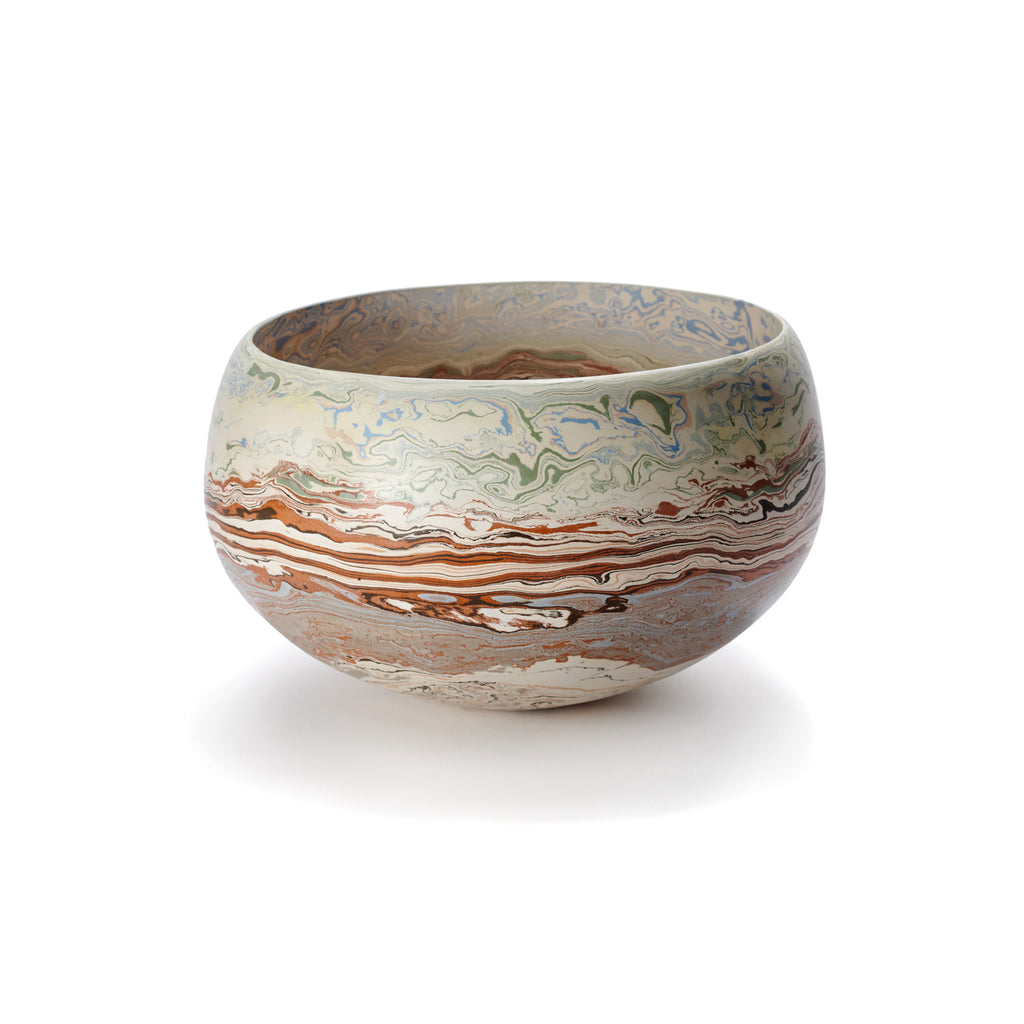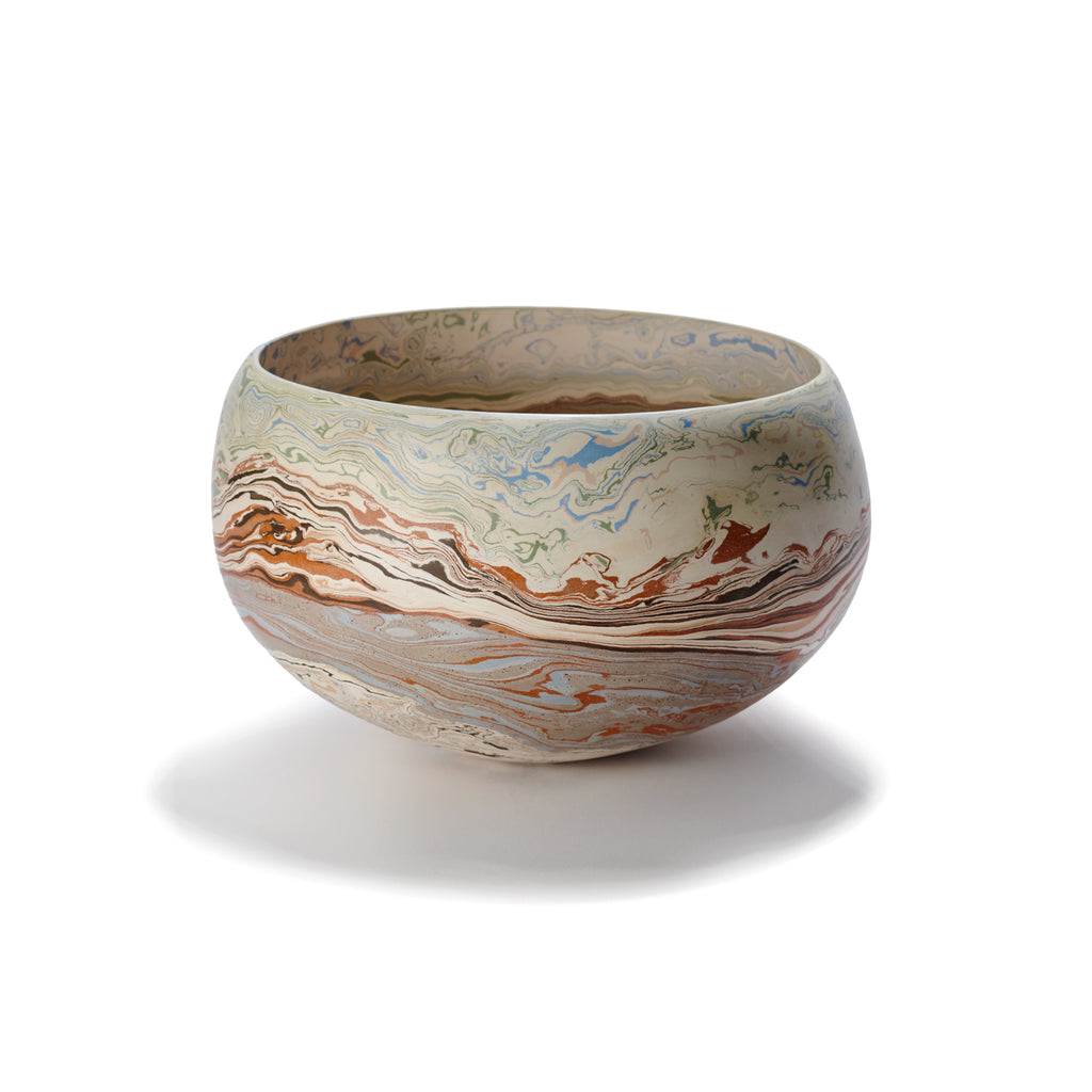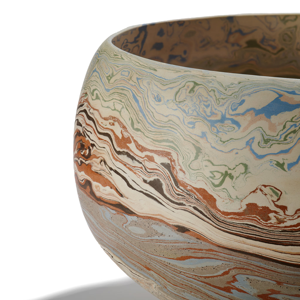 Crafted in fired earthenware and finished with Renaissance wax, this piece radiates a grounded, natural beauty. Terracotta browns and soft ivory form the base palette, evoking earth and stone, while subtle hints of blue and green flow through the surface like traces of water and vegetation. The colors layer and shift with an organic rhythm, suggesting weathered landscapes or ancient terrain. The Renaissance wax finish gives the bowl a soft, tactile sheen, enhancing the depth and warmth of the surface. Earthy, quiet, and contemplative, the piece feels like a fragment of land shaped by time and touch.