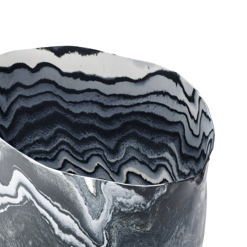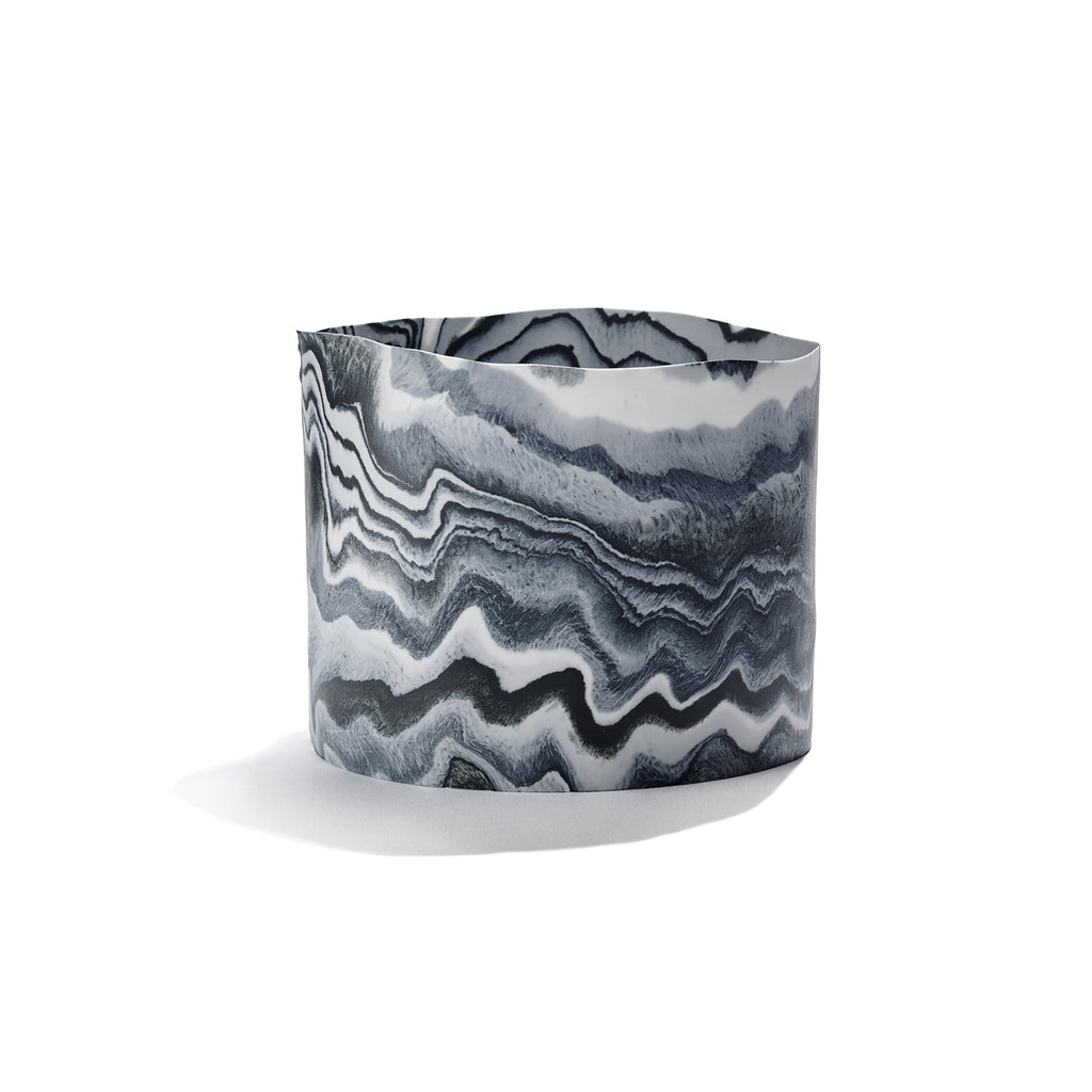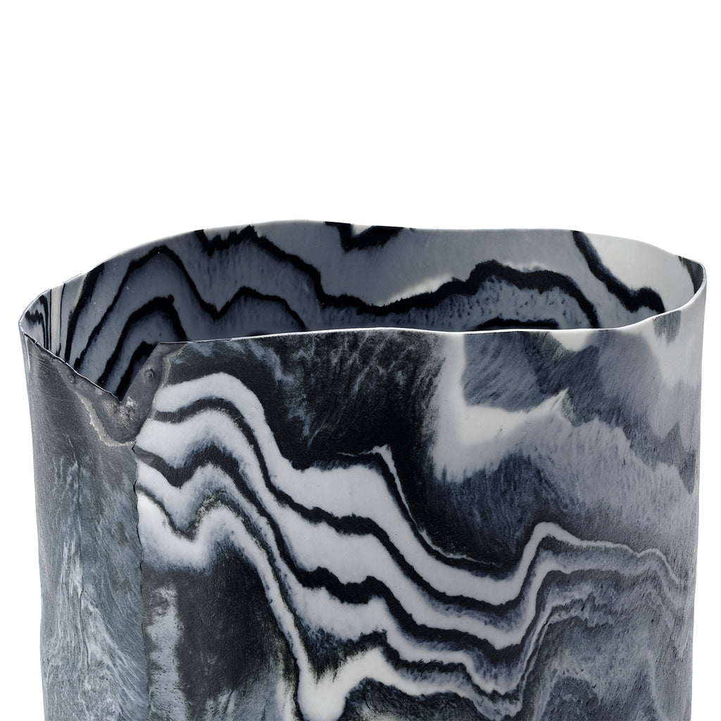 This porcelain vessel by Henk Wolvers captures the restless beauty of a storm at sea. Crafted with extraordinary thinness, the form feels fragile yet full of tension, like a wave suspended in time. Swirls of grey and soft white flow across the surface, echoing the movement of rapids whipped by wind. The lines are fluid, almost painterly, wrapping around the vessel in a rhythm that feels both chaotic and controlled. Light passes through the delicate walls, adding depth and motion to the piece. It’s a powerful work, minimal in form, but charged with the energy of a brewing storm.