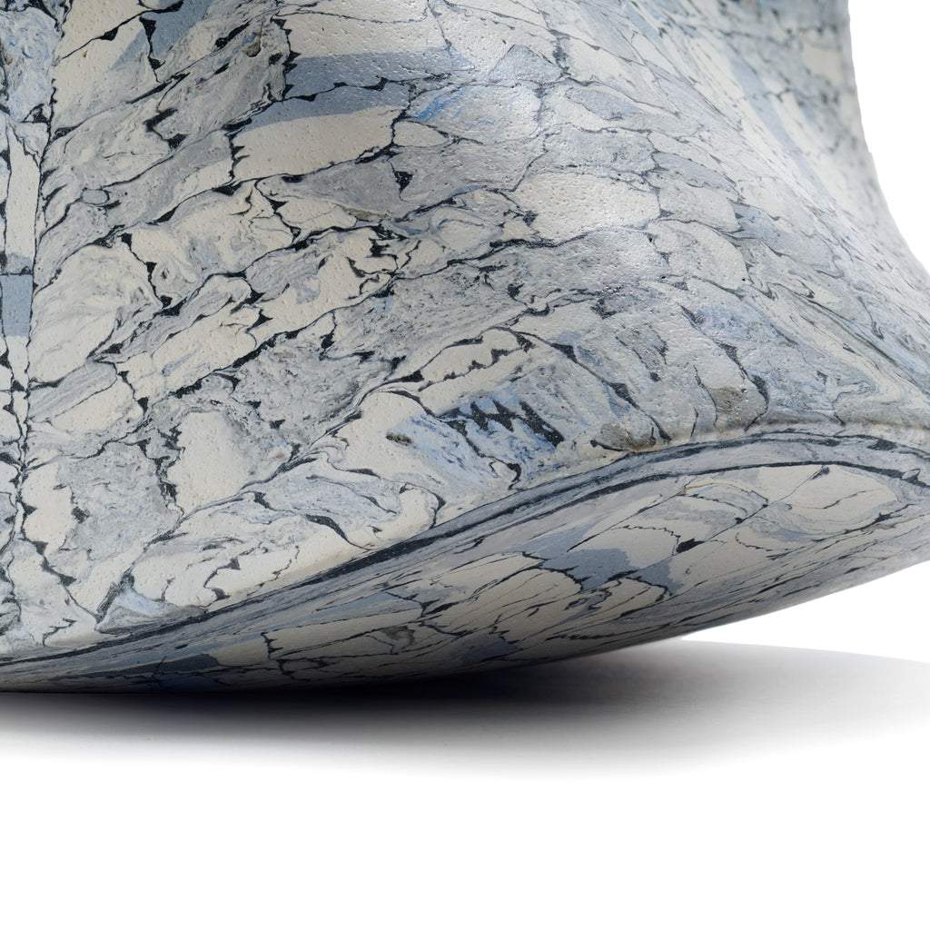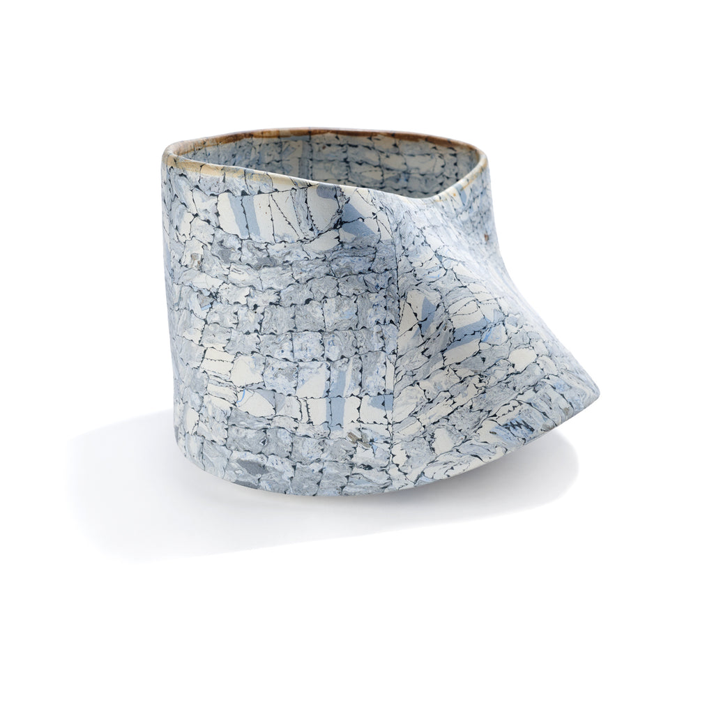 Barbara Gittings’ asymmetrical nerikomi bowl brings together the precision of layered porcelain with the unpredictability of smoke and fire. Hand-formed into an organic, flowing shape, the bowl resists symmetry, favoring a natural rhythm that feels grown rather than built. Colored clays in soft blues and greys are layered and sliced to create soft, shifting patterns within the porcelain body. Oxides and stains are worked into the surface, not painted on, giving the piece a quiet richness that feels part of the clay itself. Smoke-firing adds the final touch: carbon shadows, subtle blushes, and accidental marks that make each surface unrepeatable. Earthy, raw, and refined all at once, this bowl captures the artist deep connection to material, process, and the imperfect beauty of organic form.