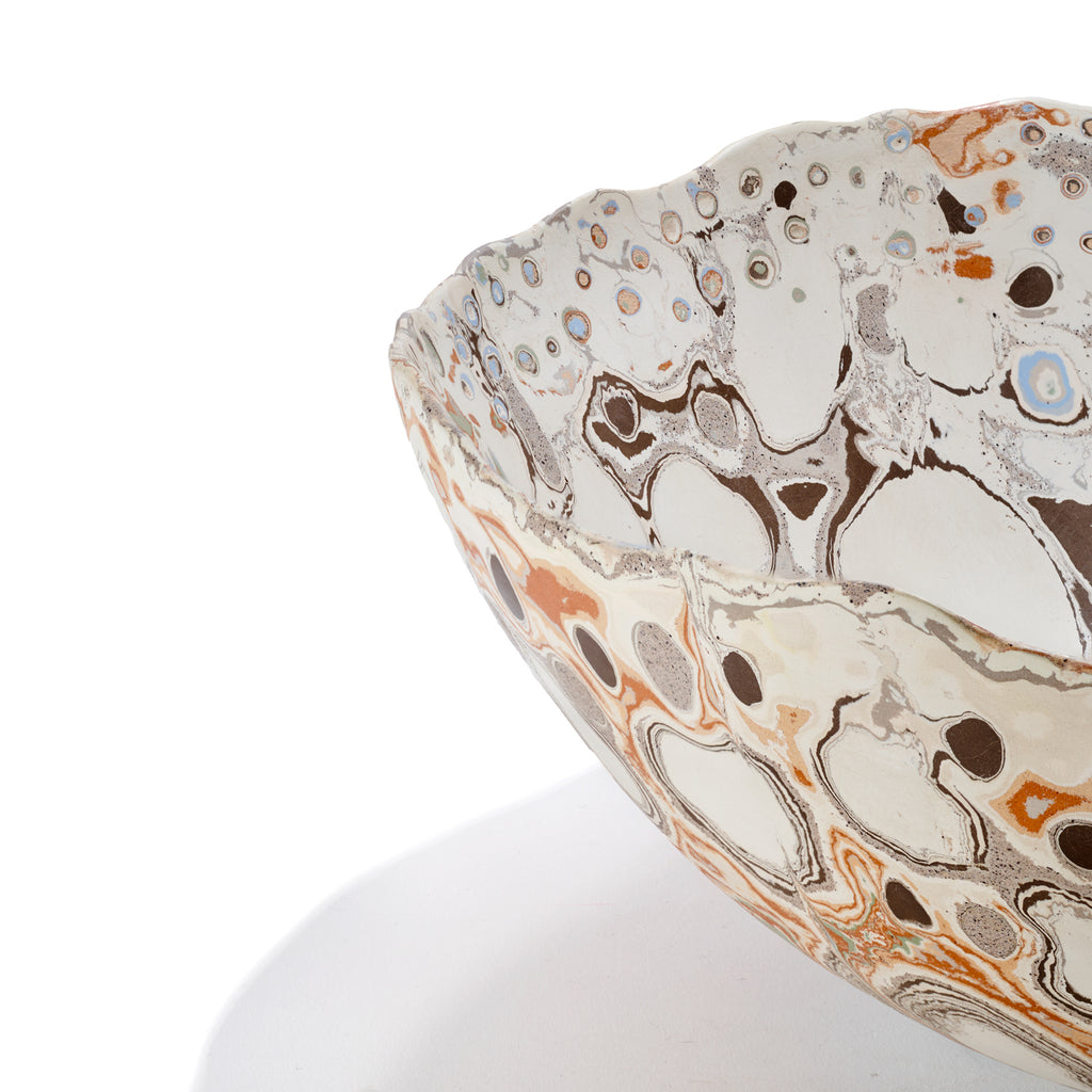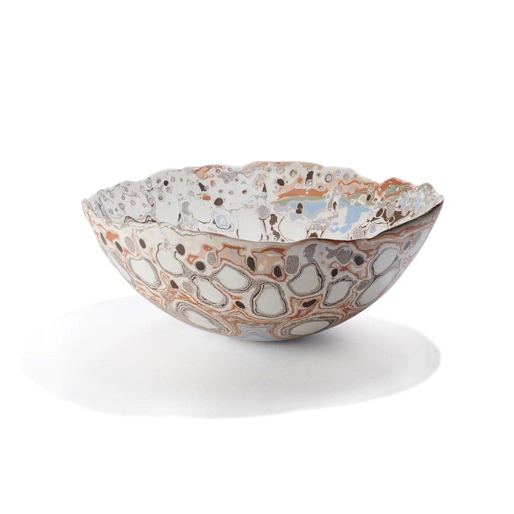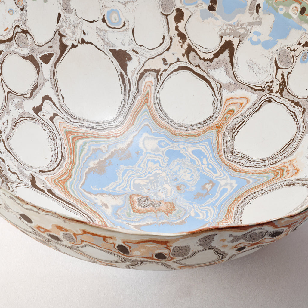 This bowl by Ben Davies, crafted in fired earthenware and finished with Renaissance wax, evokes the layered beauty of a deep canyon overpass. Terracotta brown is traced throughout, rich and earthen, while gentle blues sweep across the surface like sky meeting stone. The colors and textures echo natural erosion, wind-carved ridges, sun-bleached rock, and the shifting light of canyon walls. The Renaissance wax lends a subtle, polished sheen that enhances the tactile depth without overpowering the rawness of the material. Sculptural and grounded, the bowl feels both ancient and architectural, like a landscape held in your hands.