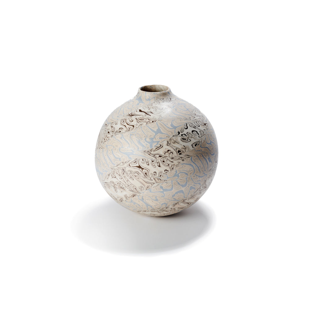 This round vessel by Ben Davies radiates quiet depth through its layered palette of earthy brown, soft ivory, and muted blue. The form is full and balanced, a gentle sphere that feels both grounded and open. Each layer of color blends into the next, like sedimentary bands or fading light across a landscape. The surface carries subtle texture, hinting at the hand behind the work. There’s a sense of natural time, built slowly, deliberately. The vessel doesn’t just hold space; it reflects it, capturing the calm complexity of land, sky, and everything in between.