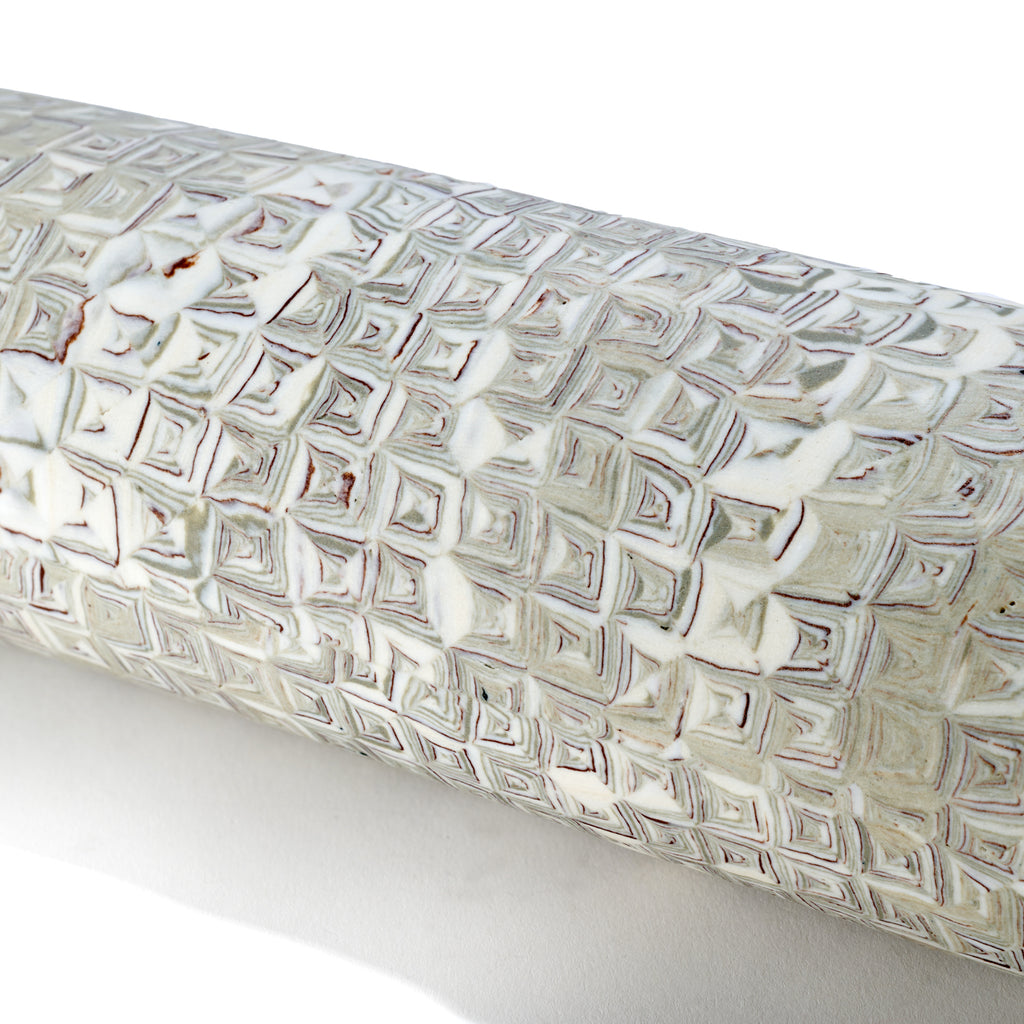 A striking interplay of grey, cream, and white tones, this piece showcases the masterful work of Pottinger. Layers of colored clay are carefully assembled and sliced to form intricate, flowing patterns that wrap around the vessel’s curved form. The elongated, elliptical shape adds a dynamic sense of movement, while the muted palette grounds the piece in a quiet elegance. Each line and curve reflect the artists deep precision and control over both form and material. A sophisticated work that balances visual complexity with serene minimalism, rewarding close inspection from every angle.