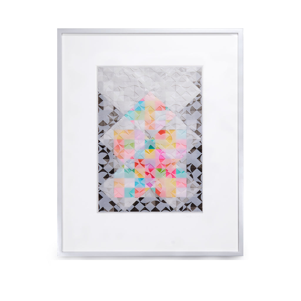 Vellum, ink on paper, graphite, cotton mat board, painted white wood frame