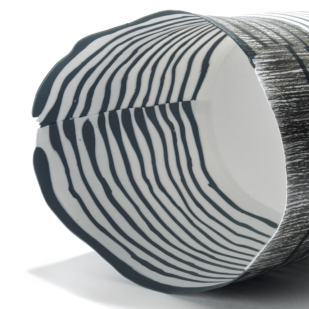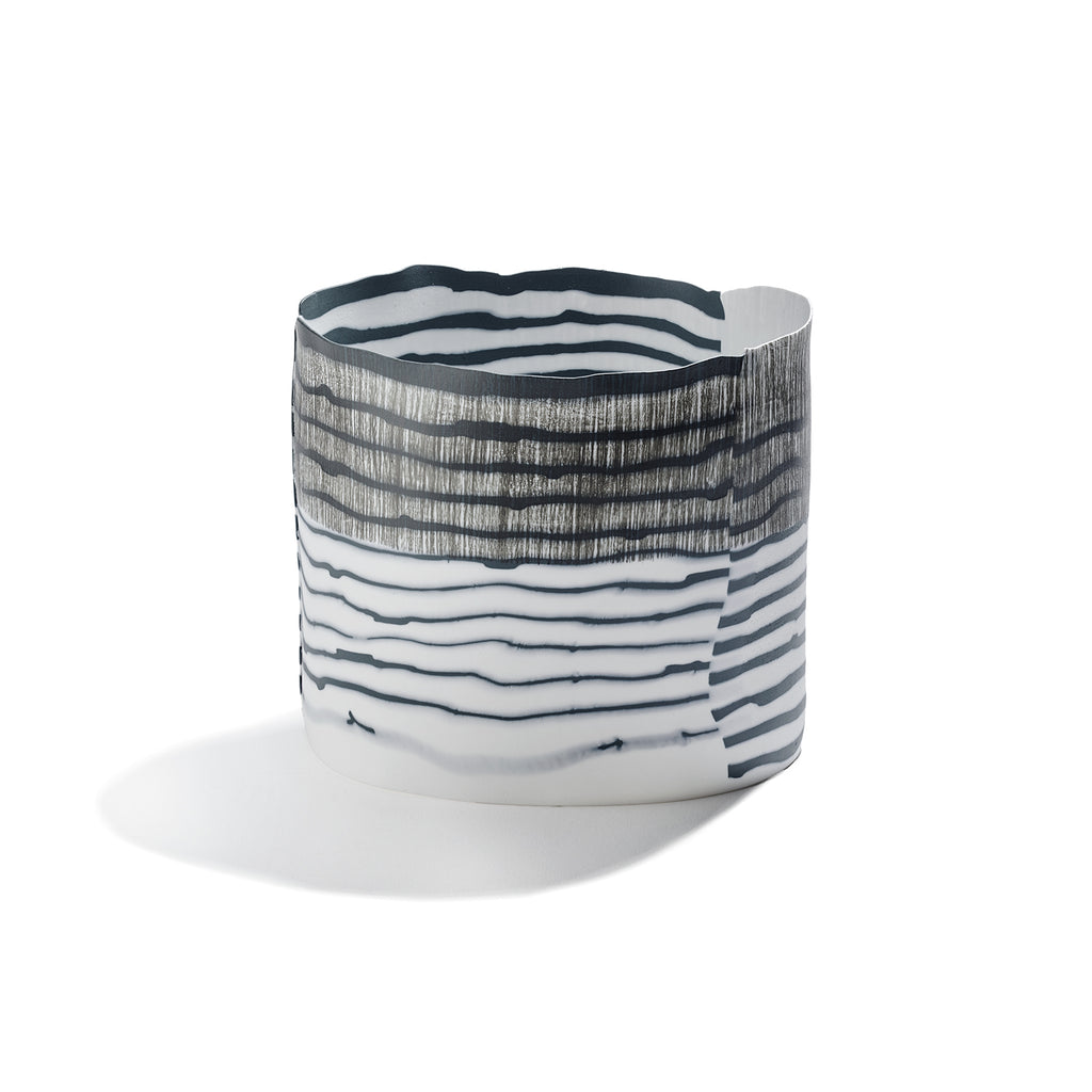 This weightless porcelain vessel is a delicate point of translucence, its surface alive with flowing blue lines broken by subtle strikes of grey. The dark blue moves like ink in water, fluid, graceful, and organic, while the grey adds contrast and depth, like shadows passing through light. Each line wraps the vessel with quiet rhythm, echoing natural patterns: water currents, wind trails, or distant landscapes. The forms are refined and minimal, allowing the surface to speak. There’s a meditative stillness to them, but also a sense of motion, light, air, and form held in perfect balance.