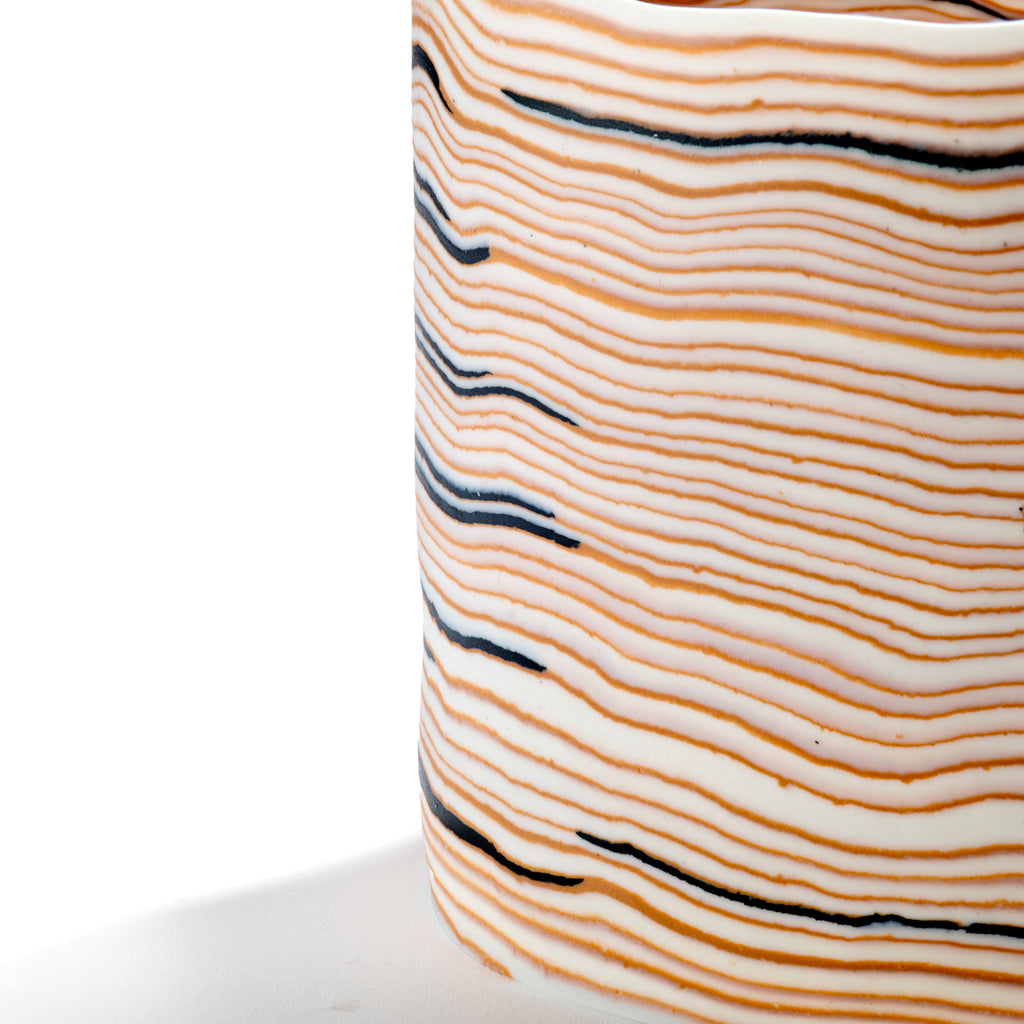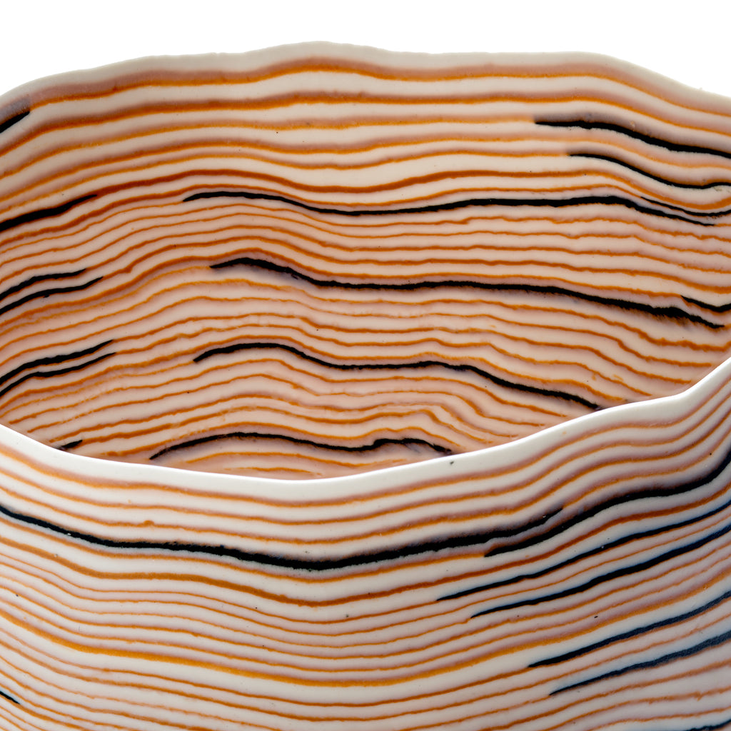 This porcelain vessel by Henk Wolvers is a study in precision and restraint. Exceptionally thin and lightweight, it feels almost weightless, as if formed from air and light. Fine, delicate lines of orange and white wrap around the form in soft, rhythmic motion, interrupted occasionally by gentle traces of blue. The surface is smooth and luminous, drawing attention to the quiet energy of the lines as they echo the vessel’s curves. Every detail is intentional, yet the overall effect is effortless; an object that embodies both technical mastery and quiet elegance.