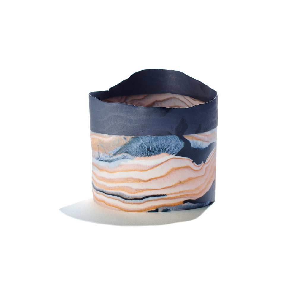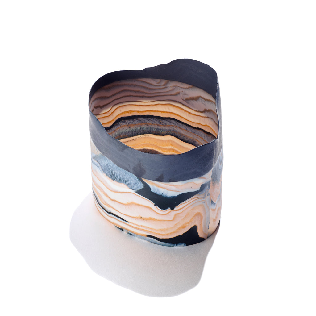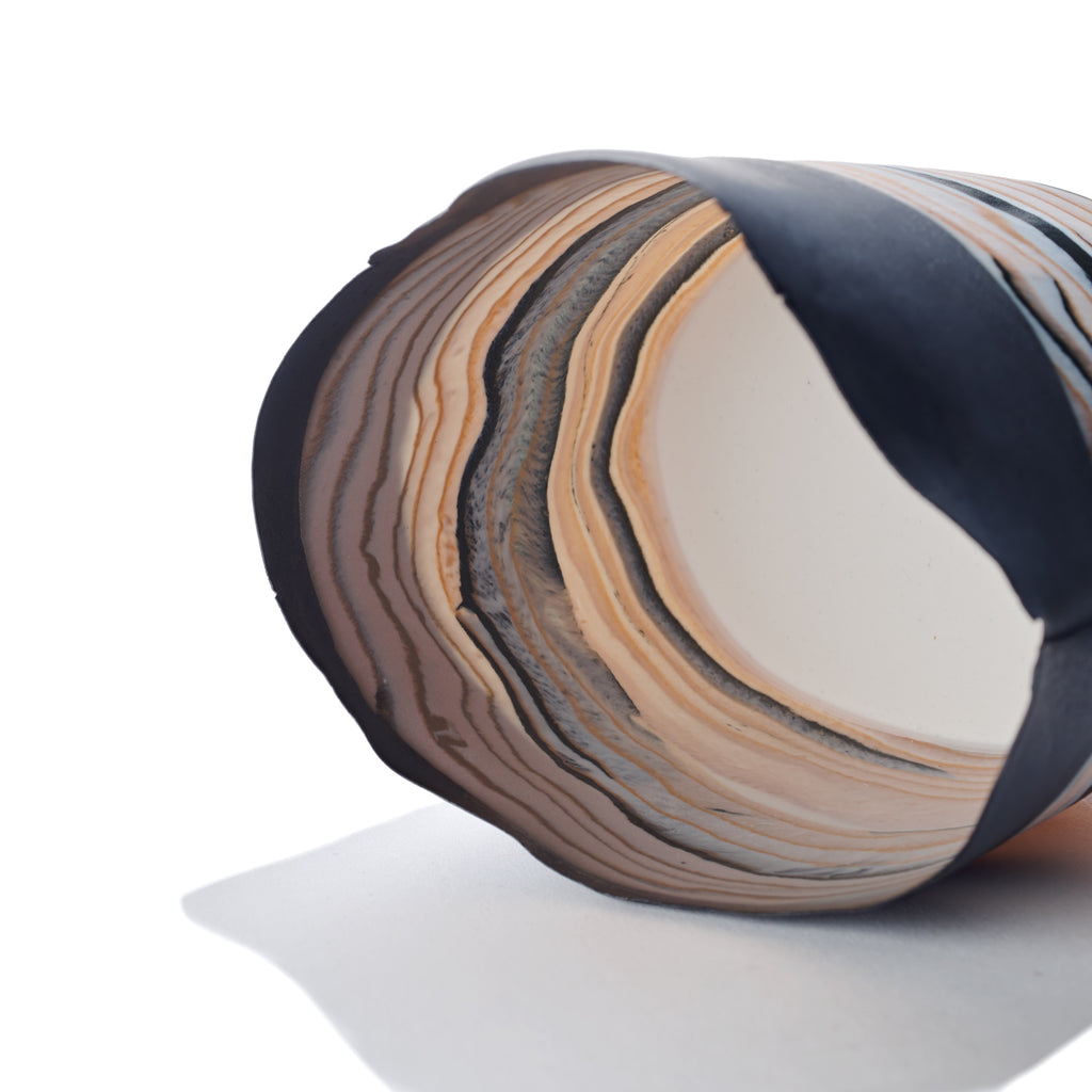 This porcelain vessel by Henk Wolvers is a striking fusion of form and color. Its organic shape flows with gentle asymmetry, like a form shaped by wind or water. Delicate waves of blue, white, and orange ripple across the surface, layered with intention but never rigid. The colors seem to float within the porcelain itself, blurring the line between surface and structure. Light dances across its curves, highlighting both translucency and depth. Wolvers’ mastery of the medium is evident in every contour, precise yet spontaneous, minimal yet alive. It feels less like an object and more like a moment captured in clay.