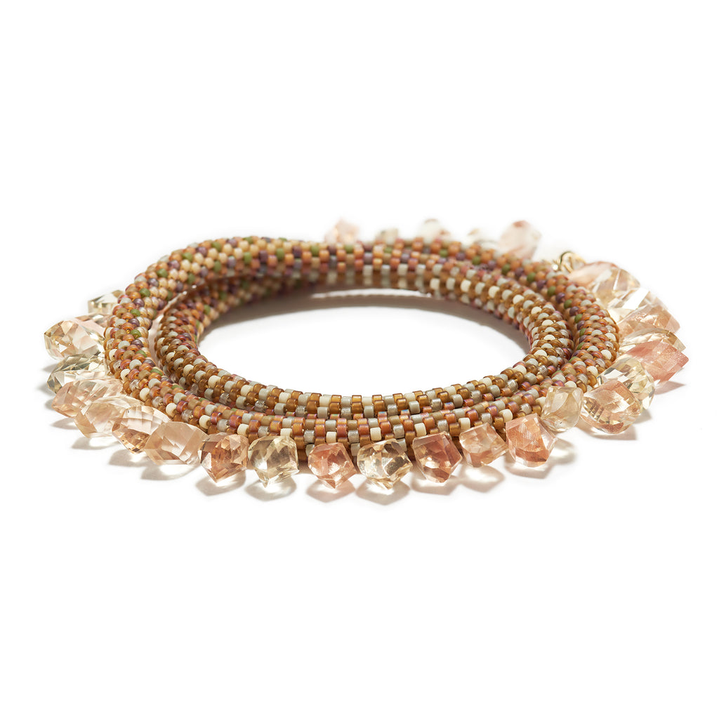 This double 'Lyda' patterned bracelet features 33 champagne and pink colored sunstones from south eastern Oregon, which have been mined, cut and faceted by Dust Devil Mining Company - winner of 16 AGTA Cutting Edge awards.