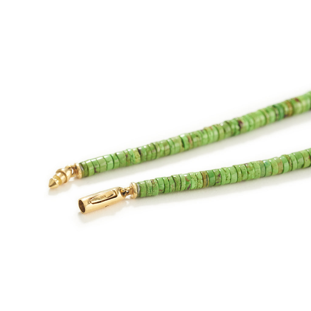18K yellow gold, gaspeite chartreuse beads, Yawa nut boulder opal, two round facetted tourmalines