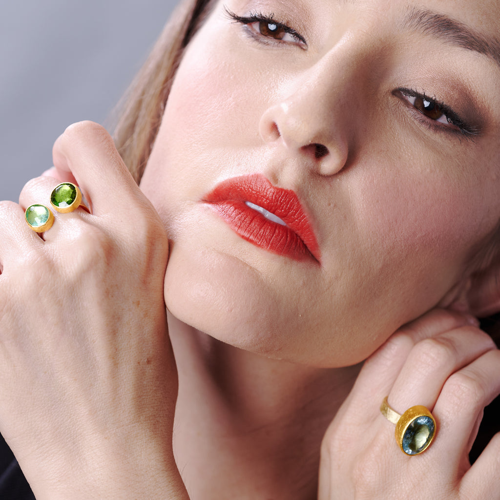 A luminous oval aquamarine rests in quiet elegance, it’s cool, sea-blue depths held within a bezel of high-karat gold. Petra Class, master of sculptural refinement, creates a ring that feels both ancient and immediate gold rendered not as ornament but as architecture, framing the gem with warmth and clarity. The smooth oval cut amplifies the stone’s crystalline light, while the handcrafted band offers a tactile connection to the artist’s touch. At once serene and radiant, this solitaire ring embodies Petra Class’s gift for distilling elemental beauty into wearable form.