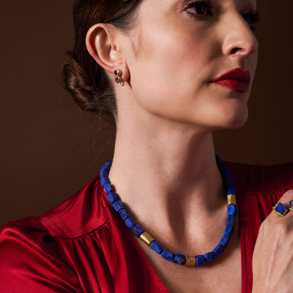 As shown with: Lapis Bead Necklace, Square Lapis Lazuli Ring, and Sapphire Slice Ring with Gold.